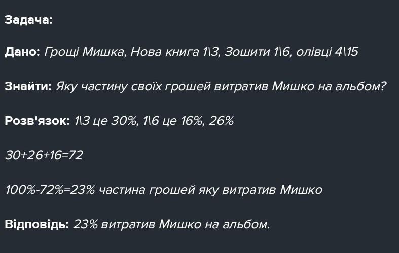 Мишко витратив своїх грошей на покупку нової книги, грошей – на купівлю зошитів, грошей – для придбання олівців, решту – для придбання альбому. Яку частину своїх грошей Мишко витратив на купівлю альбому?