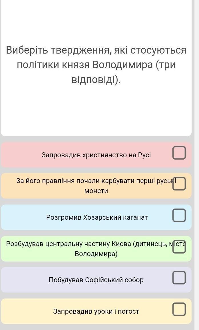 Виберİть твердження, які стосуються політики князя Володимира (три відповіді)