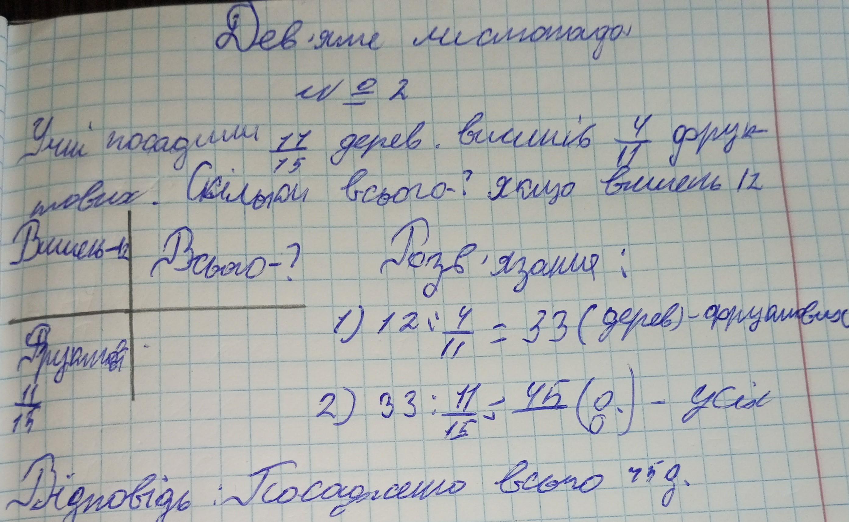 2. Учні 6 класу посадили навколо школи дерева. Фруктові дерева становили 11/15 посаджених дерев. Вишні становили4/11 фруктових дерев. Скільки всього дерев посадили шестикласники, якщо вишень було 12 дерев ?