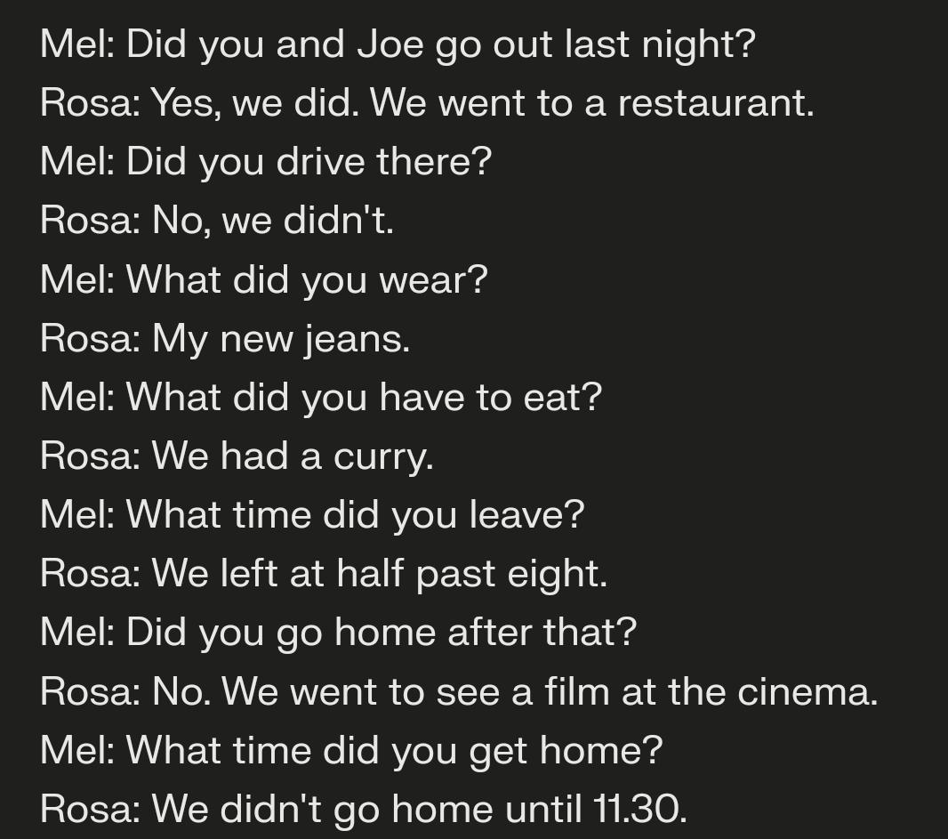 3 Complete the conversation. Put one word in each gap. Mel Did you and Joe go out last night? Rosa Yes, we did. We went to a restaurant. Mel Did you drive there? Rosa No, we ¹ Mel What did you wear? Rosa 12 Mel What did you have to eat? Rosa 1³ a curry. Mel What time did you leave? Rosa We4. Mel Did you go home after that? Rosa No. We 5 Mel What time did you get home? Rosa We didn't . We went by bus. my new jeans. at half past eight. a film at the cinema. home until 11.30.