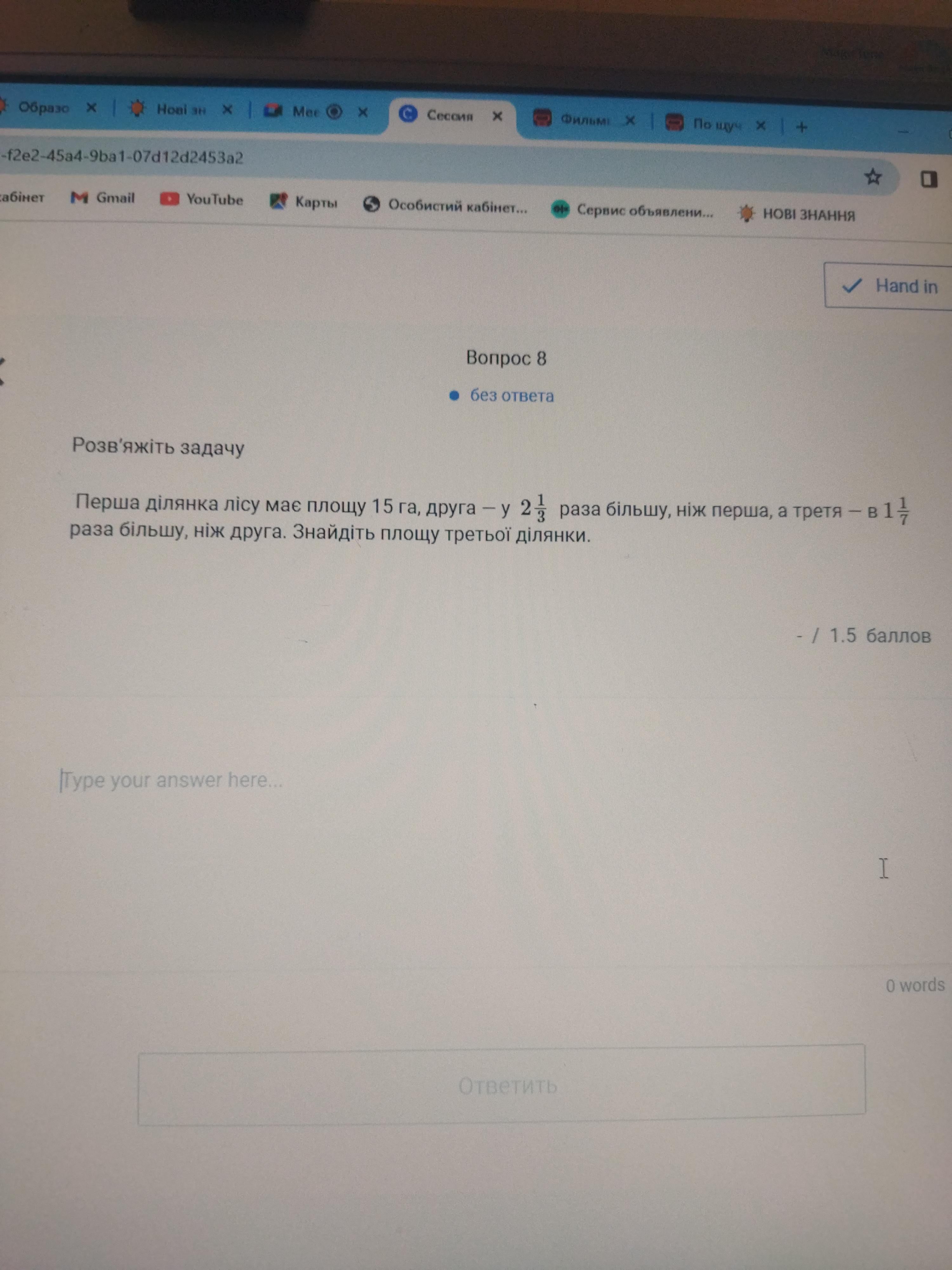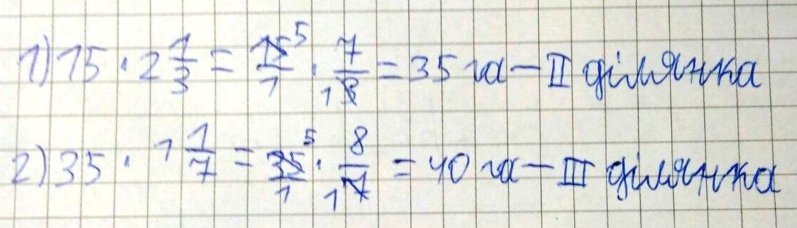 Розв'яжіть задачу Перша ділянка лісу має площу 15 га, друга - у 2 1/3 раза більшу, ніж перша, а третя - в 1 1/7 раза більшу, ніж друга. Знайдіть площу третьої ділянки.