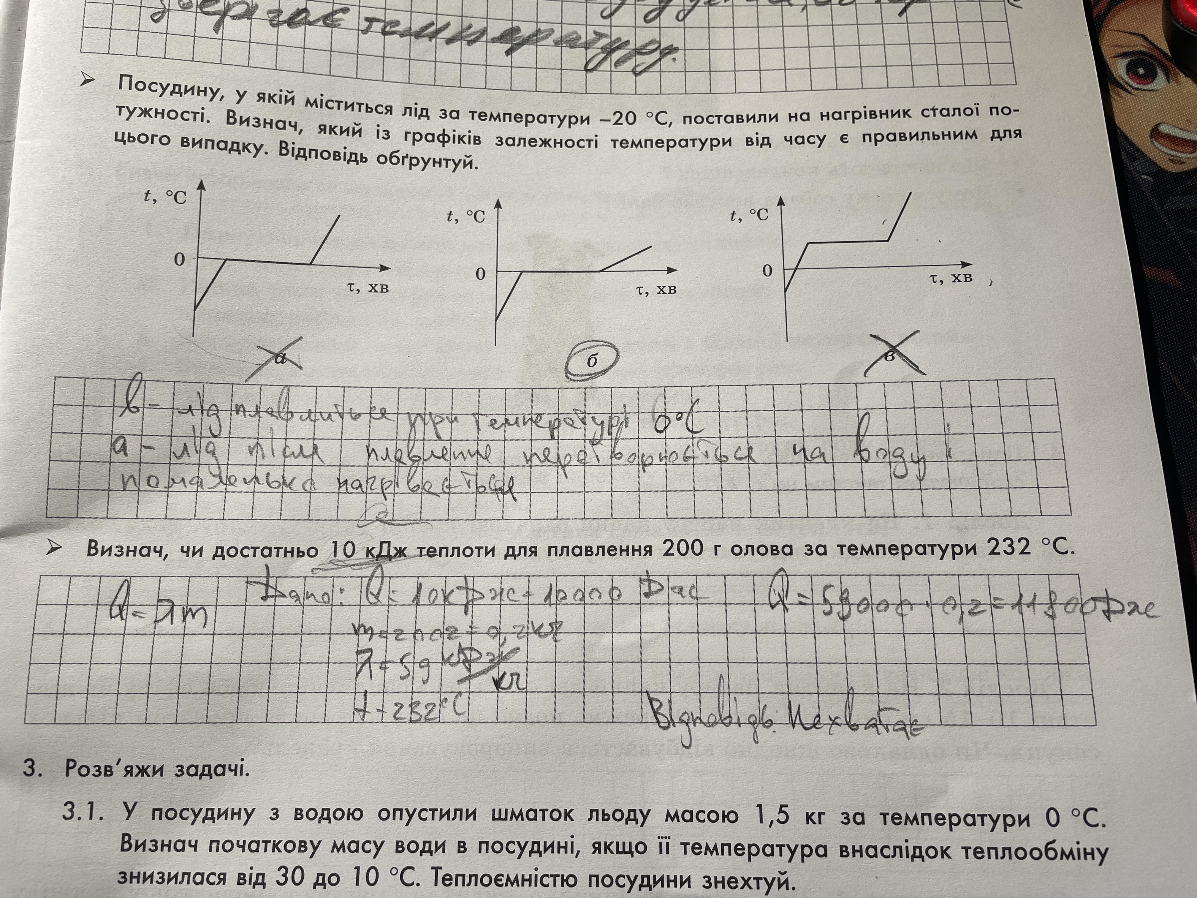 Посудину, у якій міститься лід за температури -20С, поставили на нагрівник сталої потужності. Визнач, який із графіків залежності температури від часу є правильним для цього випадку. Відповідь обґрунтуй.