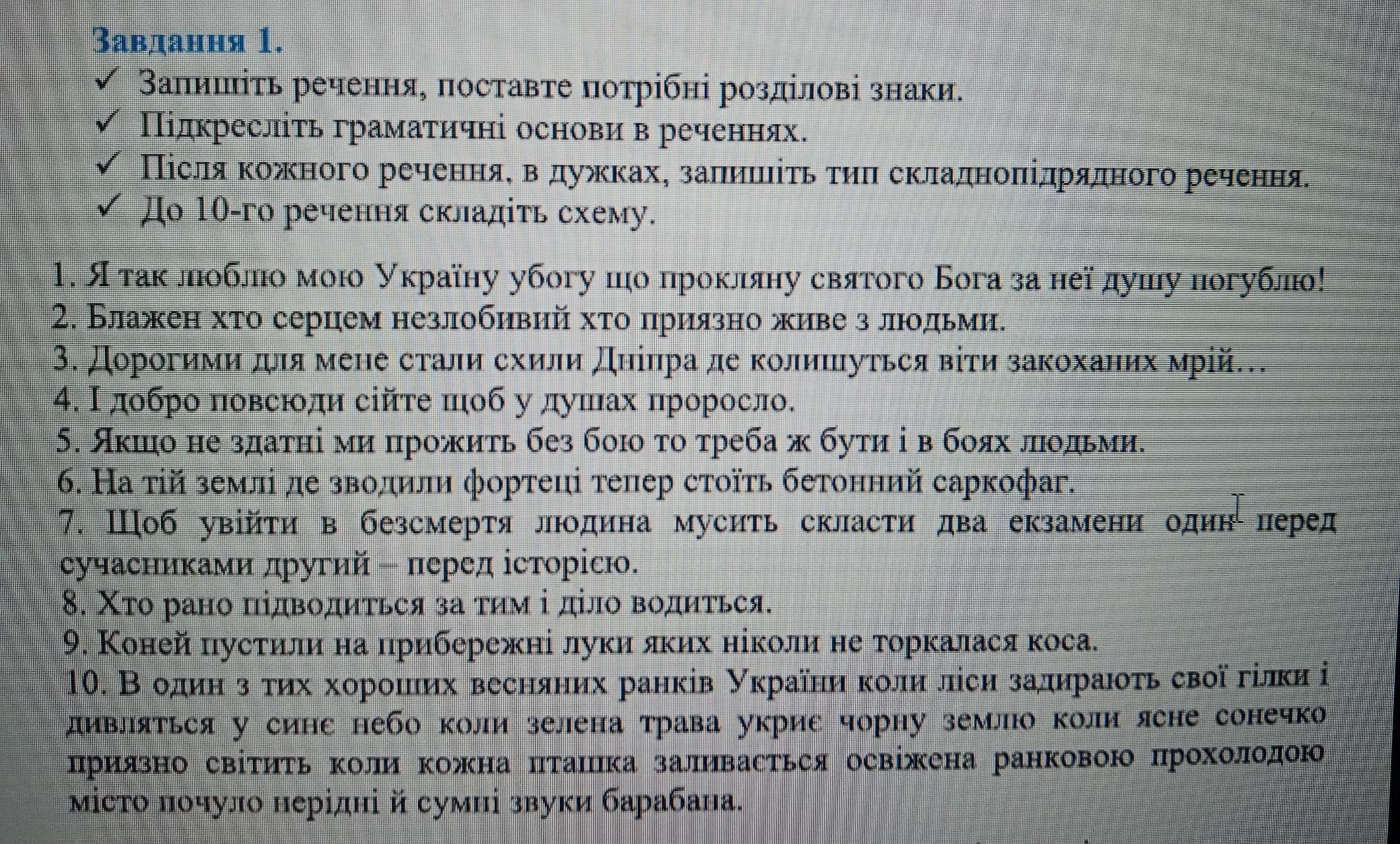 Завдання 1. Запишіть речення, поставте потрiбнi розділові знаки. Підкресліть граматичні основи в реченнях. Після кожного речення, в дужках, запишіть тип складнопідрядного речення. До 10-го речення складіть схему.