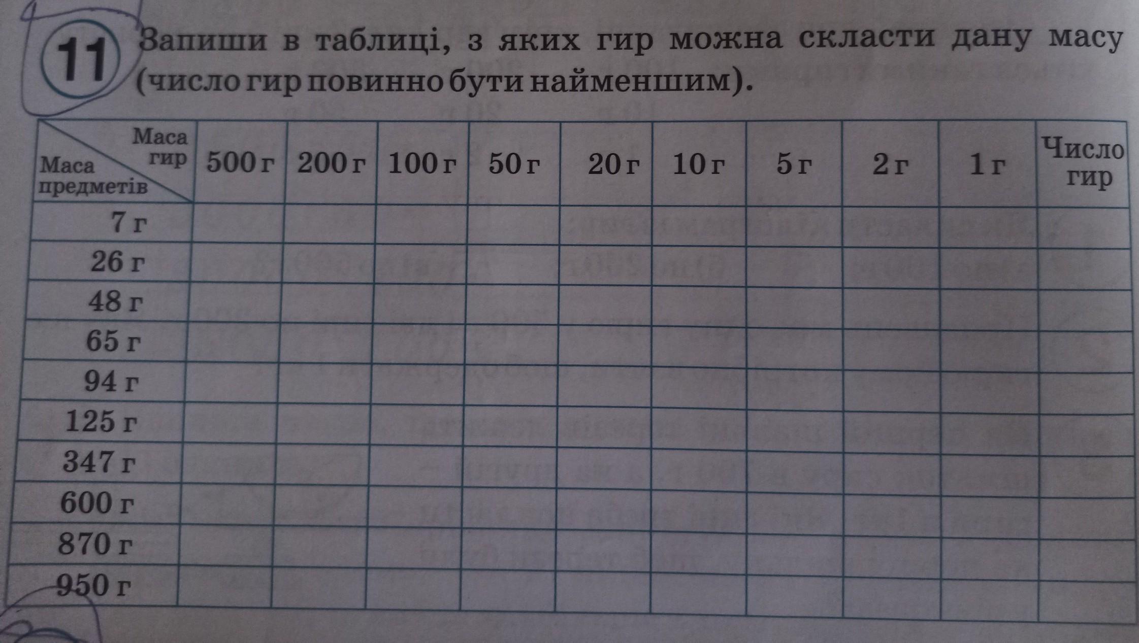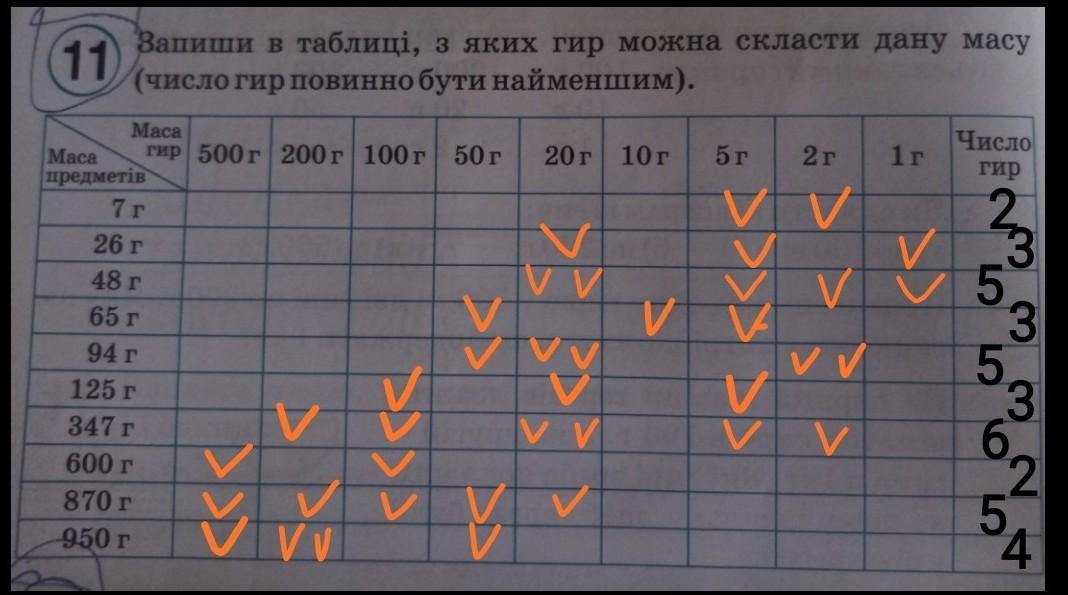 Оранжевыми "галочками" отмечено, какие гири нужно взять. Если в одном квадратике стоят две "галочки", значит нужно взять две такие гири