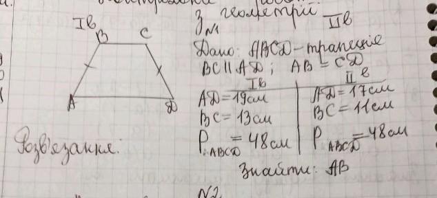 Для того, щоб знайти сумму сторін АВ і СD, треба віб периметра відняти AD i BC. Далі, так як в нас трапеція, а бічні сторони рівні, ми ділимо сумму бічних сторін навпіл. В нас вийшов розв'язок: