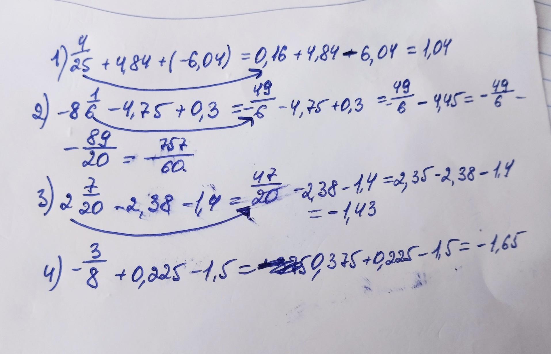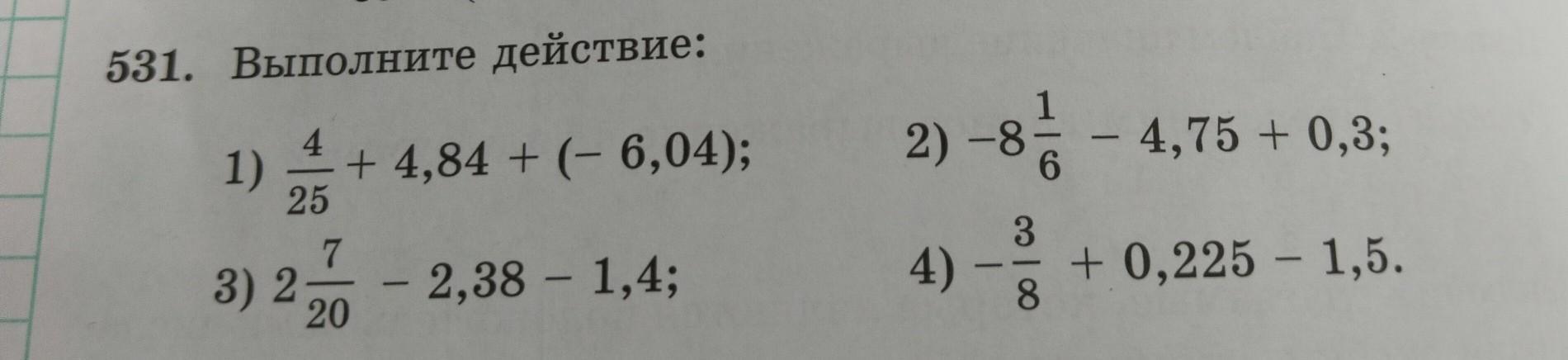531. Выполните действие: 1) ⁄⁄ + 4,84 + (− 6,04); 25 7 20 3) 2 2,38 - 1,4; -8/1 − 4,75 + 0,3; 2)-8 3 4) −³ + 0,225 – 1,5. 8