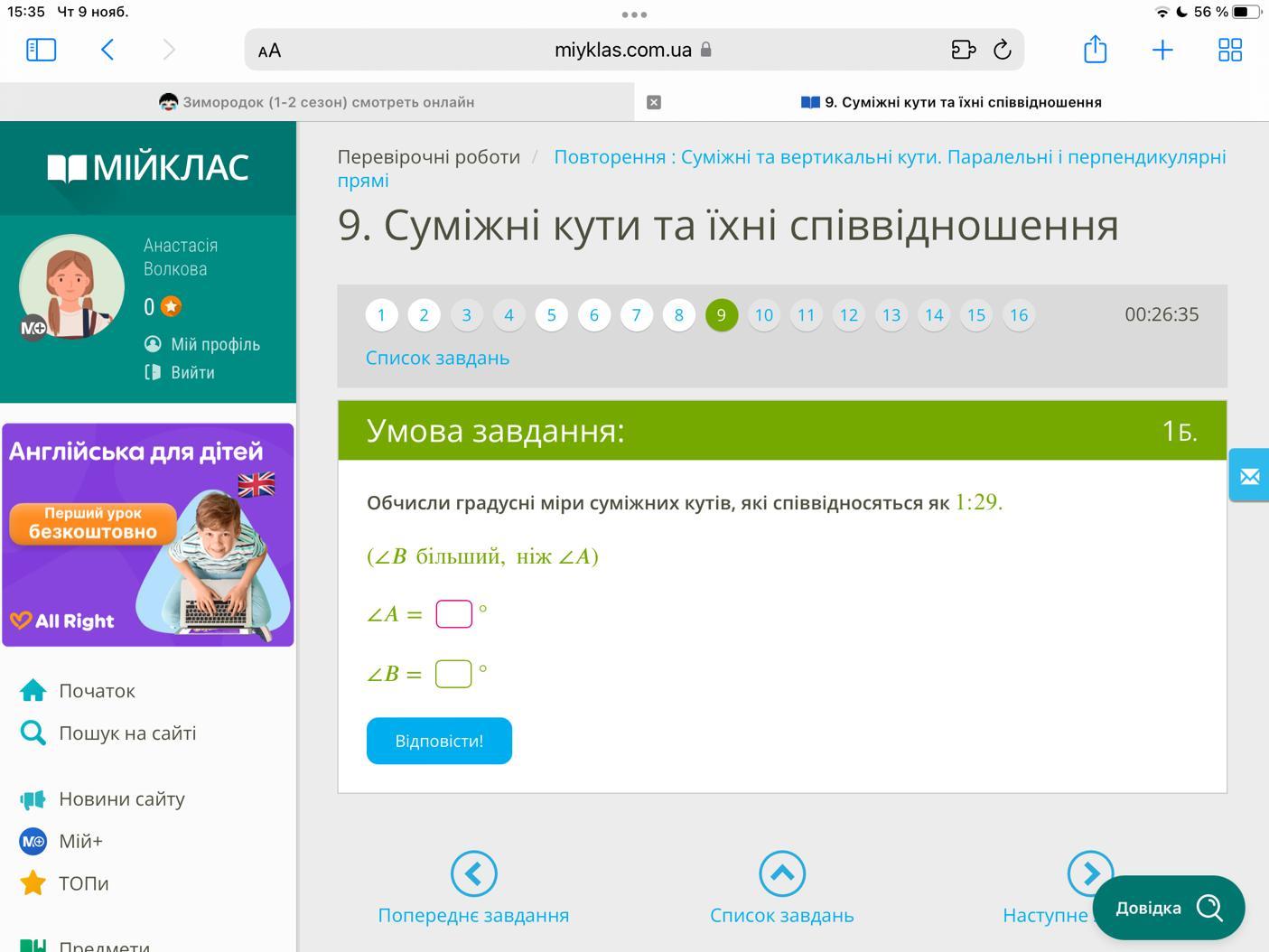 кут Б (найбільший) = 29k, тоді кут А = 1k (k)