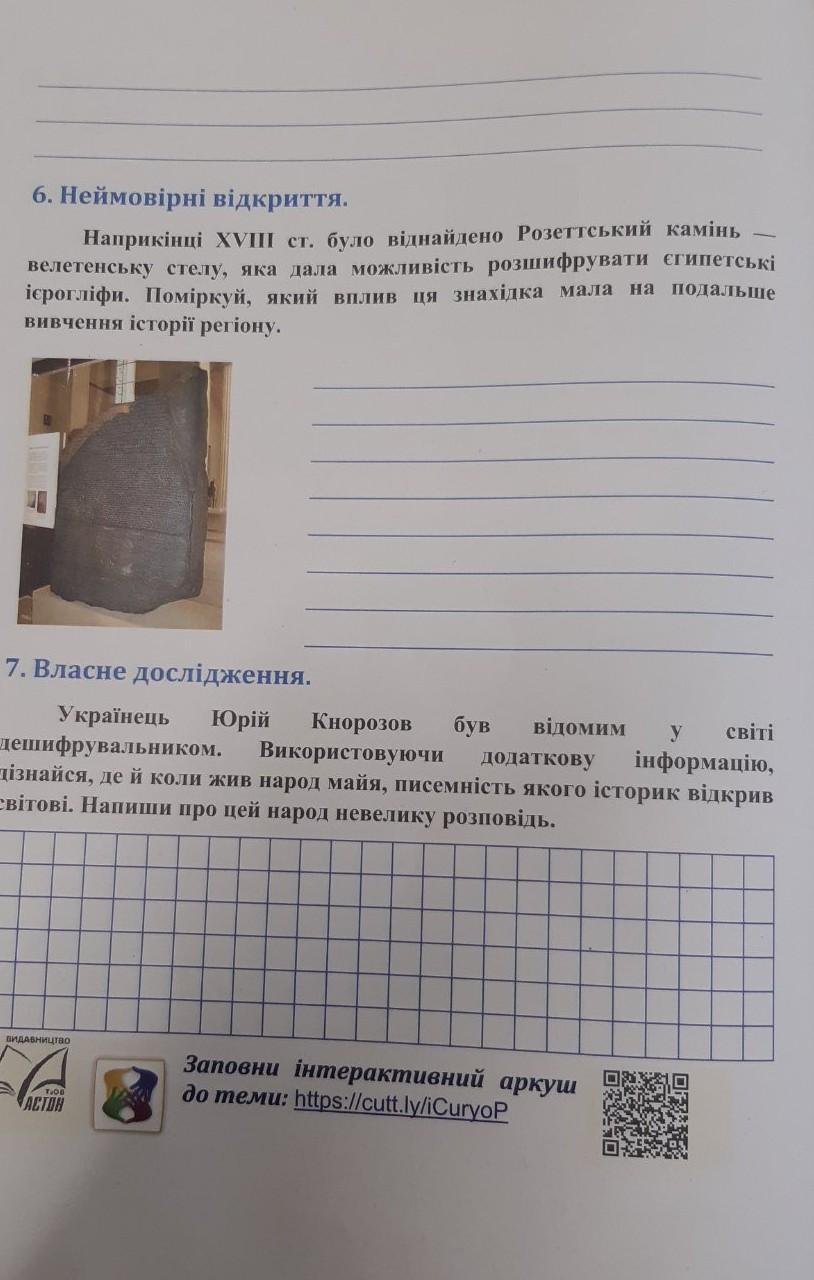 - Власне дослідження. Українець Юрiй Кнорозов був відомим шифрувальником. Використовуючи додаткову у світі інформацію, знайся, де й коли жив народ майя, писемність якого історик відкрив тові. Напиши про цей народ невелику розповідь.
