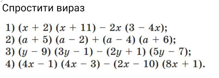 1) (х+2)(х+11)-2х(3-4х)=х²+2х+11х+22-6х+8х²=9х²+7х+22