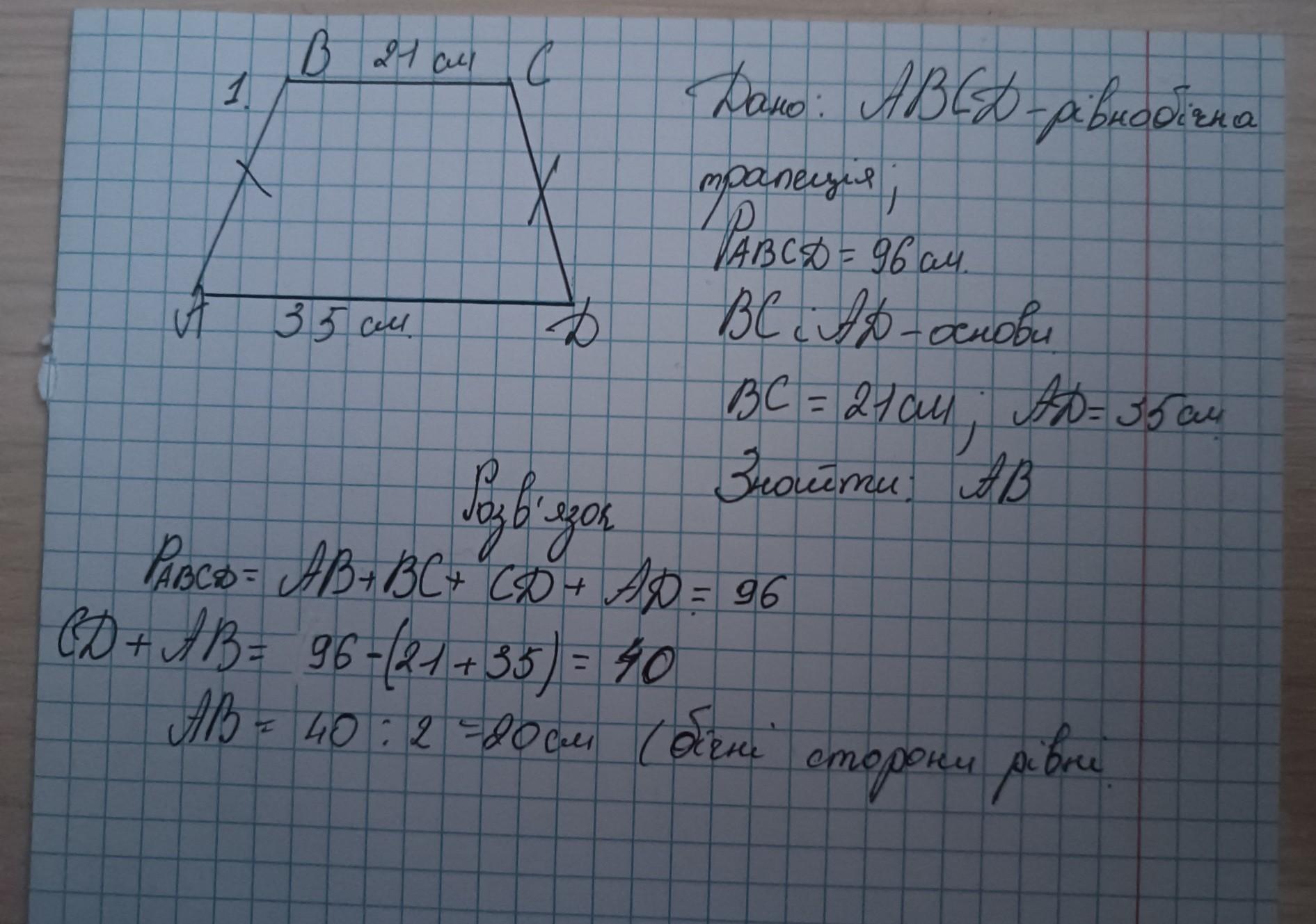 1. Периметр рівнобічної трапеції дорівнює 96 см. Знайти бічну сторону, якщо основи трапеції дорівнюють 21 см та 35 см.