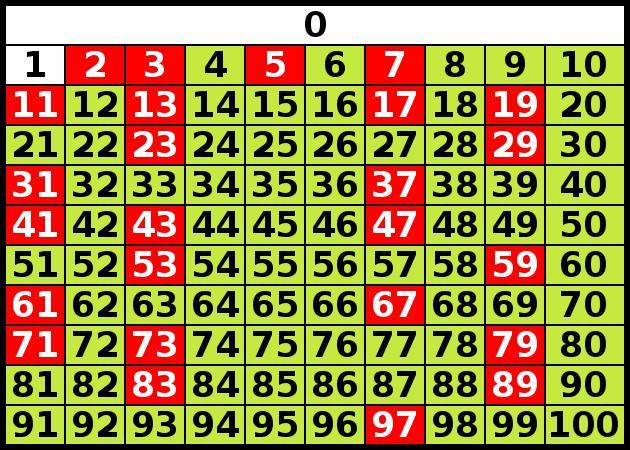 Пошаговое объяснение: Цілі числа від нуля до ста. Прості числа відмічені червоним.