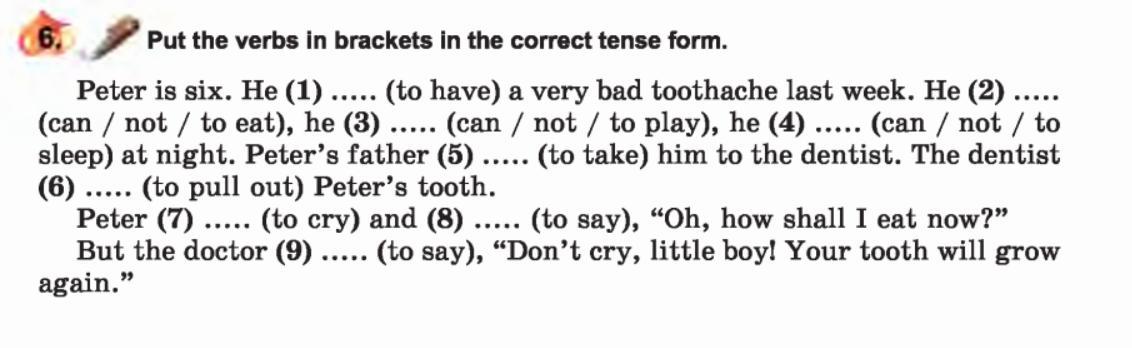 Peter is six. He (1 ) ..... (to have) a very bad toothache last week. He (2 ) ......