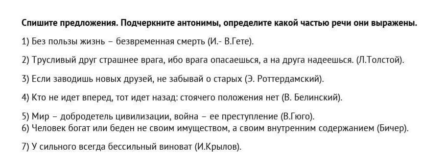 Спишите предложения. Подчеркните антонимы, определите какой частью речи они выражены. 1) Без пользы жизнь - безвременная смерть 2) Трусливый друг страшнее врага, ибо врага опасаешься, а на друга надеешься. 3) Если заводишь новых друзей, не забывай o старых 4) Кто не идет вперед, тот идет назад: стоячего положения нет 5) Мир - добродетель цивилизации, война - ее преступление 6) Человек богат или беден не своим имуществом, а своим внутренним содержанием 7) У сильного всегда бессильный виноват