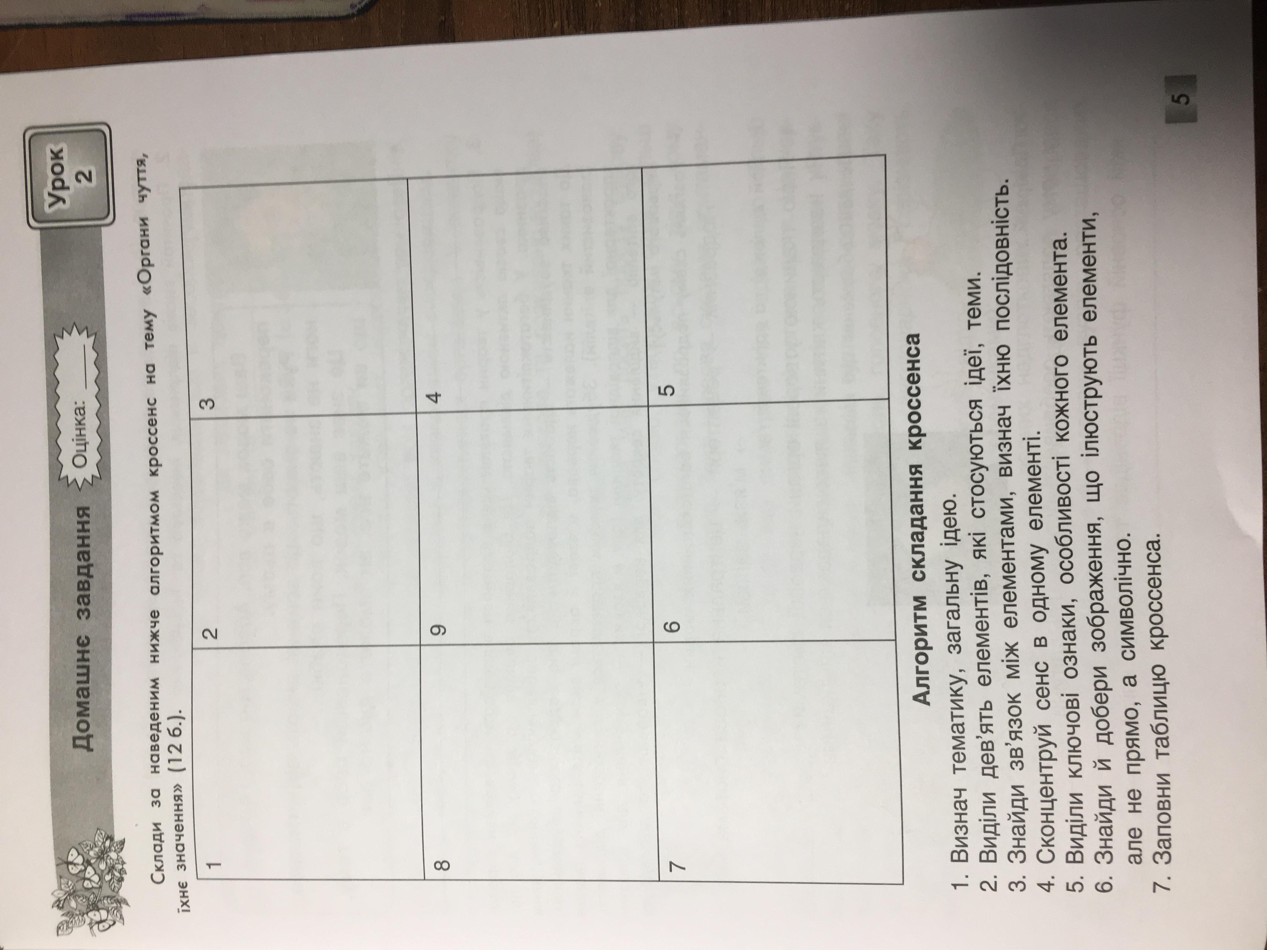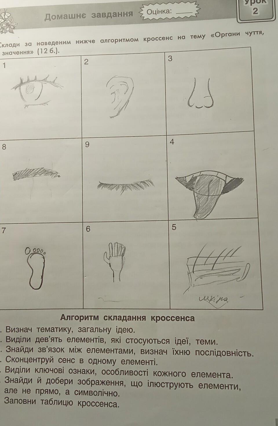 Склади за наведеним нижче алгоритмом кроссенс на тему «Органи чуття, їхнє значення» (12 б.). 1 2 3 8 9 7 6 5 Алгоритм складання кроссенса 1. Визнач тематику, загальну ідею. 2. Виділи дев'ять елементів, які стосуються ідеї, теми. 3. Знайди зв'язок між елементами, визнач їхню послідовність. 4. Сконцентруй сенс в одному елементі. 5. Виділи ключові ознаки, особливості кожного елемента. 6. Знайди й добери зображення, що ілюструють елементи, але не прямо, а символічно. 7. Заповни таблицю кроссенса.