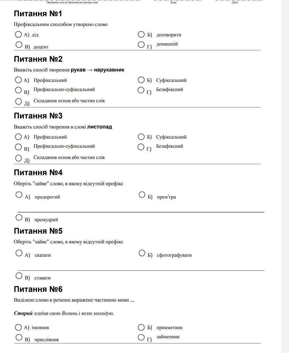 Питання № 1 Префіксальним способом утворено слово А) дiд B) доцент Питання №2 Вкажіть спосіб творення рукав-нарукавник A) Префіксальний Префіксально-суфіксальний Складання основ або частин слiв B) Д) Питання №93 Вкажіть спосiб творення в слові листопад А) Префіксальний B) Д) Питання №4 Оберіть "зайве" слово, в якому відсутній префікс А) предорогий Префіксально-суфіксальний Складання основ або частин слiв в) премудрий Питання №95 Оберіть "зайве" слово, в якому відсутній префікс А) сказати В) ставати Питання № 6 Виділене слово в реченні виражене частиною мови .... Старий згадав свою Волинь і волю молодую. А) iменник В) прислівник о Б) договорити Домашній Г) Б) Суфіксальний Бeзaфikcний Г) Б) Суфіксальний Безафіксний Г) Б) прем'єра О Б) сфотографувати Б) прикметник займенник Г)