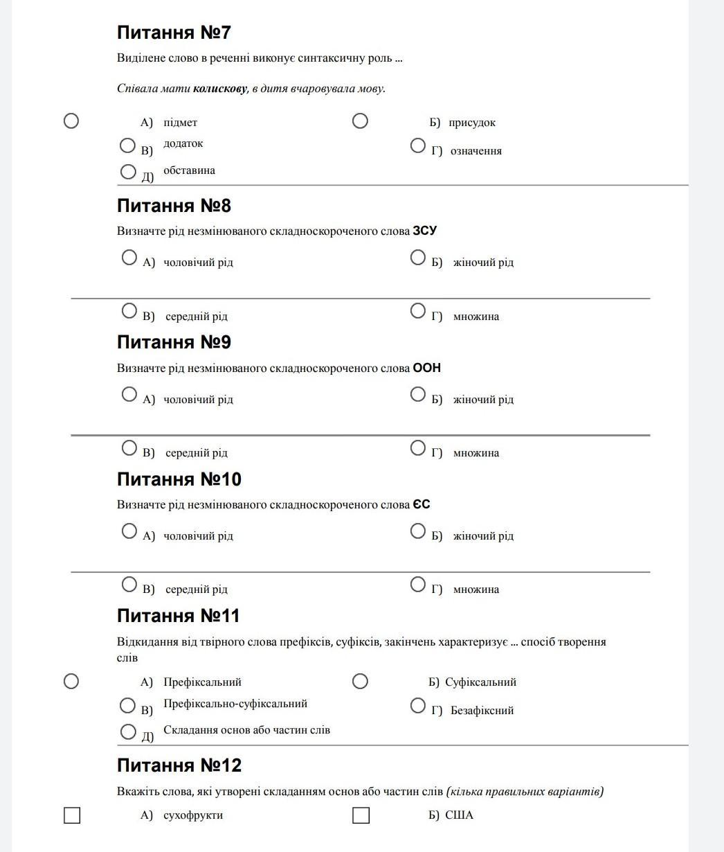 Питання №97 Видiлене слово в реченні виконує синтаксичну роль ... Співала мати колискову, в дитя вчаровувала мову. А) підмет додаток B) Д) Питання №8 Визначте рiд незмiнюваного складноскороченого слова ЗСУ А) чоловічий рід обставина Б) присудок Г) означення B) cepeднiй рід Питання №29 Визначте рiд незмiнюваного складноскороченого слова ООН А) чоловічий рід B) cepeднiй рiд Питання №910 Визначте рiд незмiнюваного складноскороченого слова ЄС А) чоловічий рід B) cepeднiй рiд Питання №11 Б) ЖІНОЧИЙ Рiд Префіксально-суфіксальний Складання основ або частин слiв Г) множина Б) Жіночий рід г) множина Б) Жіночий рід г) множина Відкидання від твірного слова префіксів, суфіксів, закінчень характеризує ... спосіб творення слів A) Префіксальний B) Д) Питання №12 Вкажіть слова, які утворені складанням основ або частин слів (кілька правильних варіантів) A) сухофрукти Б) США Б) Суфіксальний г) Безафіксний