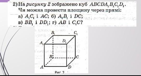 2) На рисунку 2 зображено куб АBCDA B C D.. Чи можна провести площину через прямi: a) A,C, i AC; 6) A,B, i DC; B) BB, i DD,; r) AB i C,C?