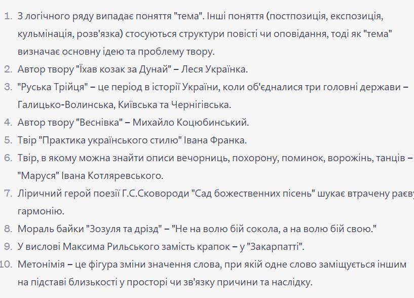 Виконайте завдання, дотримуючись чіткості й лаконічності у висловлюваннях. 1. Укажіть, яке з понять випадає з логічного ряду: постпозиція, експозиція, кульмінацiя, тема, розв'язка. Свій вибір обгрунтуйте. 2. Хто автор твору «Їхав козак за Дунай»? 3. Що таке «Руська Трійця»? 4. Хто є автором твору «Веснівка»? 5. Укажіть назву твору й автора слів: Ладить юриста на смак свій права, З диспутів учню тріщить голова, Тих непокоїть Венерин амур, Всякому голову крутить свій дур. 6. У якому творі (назва й автор твору) можна знайти і описи вечорниць, і похорону, і поминок, і ворожінь, і танців та всіляких забав? 7. Що шукає ліричний герой поезії Г.С.Сковороди «Сад божественних пісень»? 8. Назвiть мораль байки Г.С.Сковороди «Зозуля та дрiзд». 9. У вислів Максима Рильського замість крапок впишіть назву твору: у «Таємниця живучості «...» - в глибокій сердечності, у немеркнучім і чистім, як день, сяєві життєвої правди». 10. Дайте визначення метонімії.