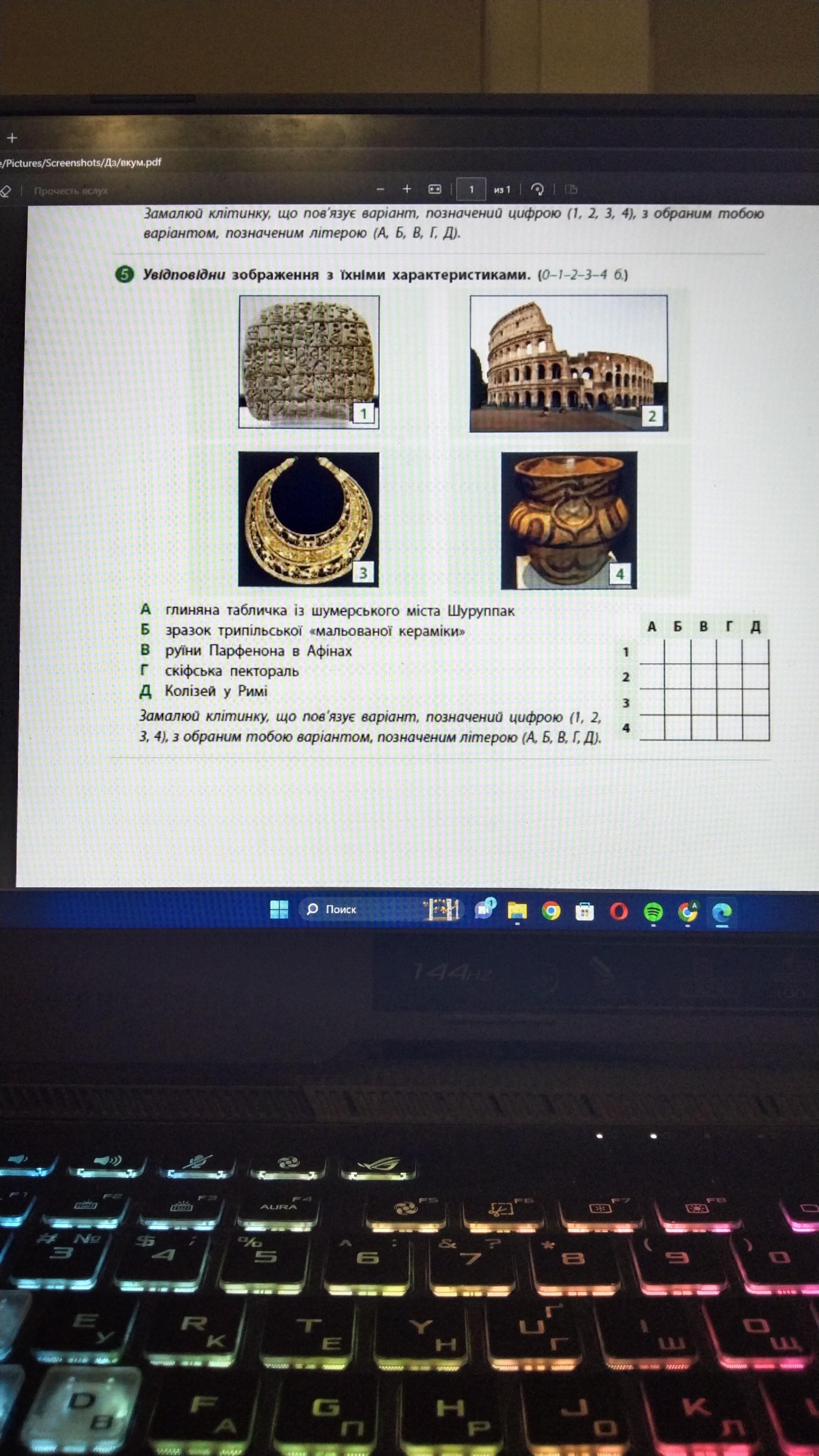 Замалюв клітинку, що пов'язує варіант, пазначений цифрою (1, 2 3, 4), з обраним тобою варіантом, позначеним літерою (А. Б. В. Г. Д.).