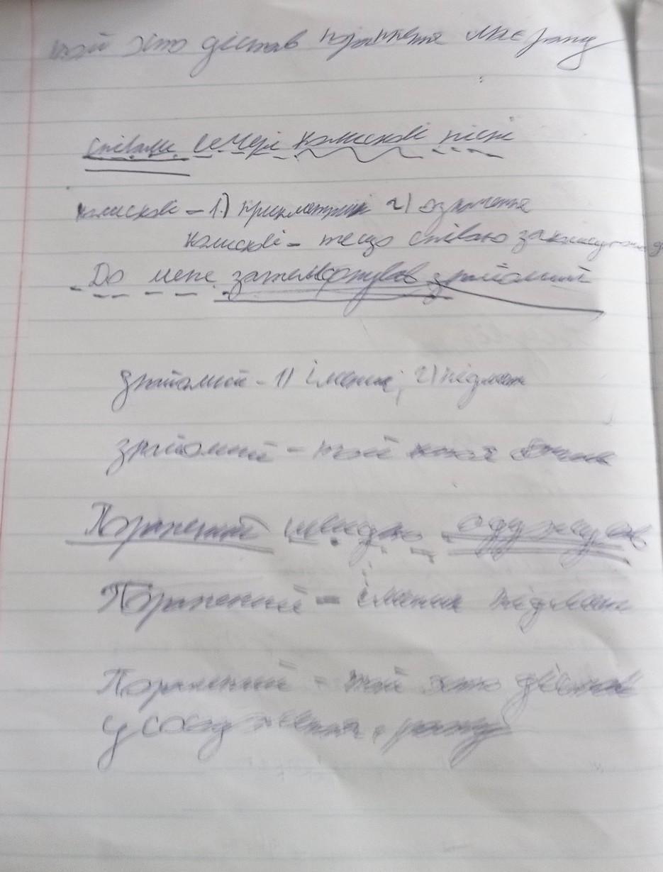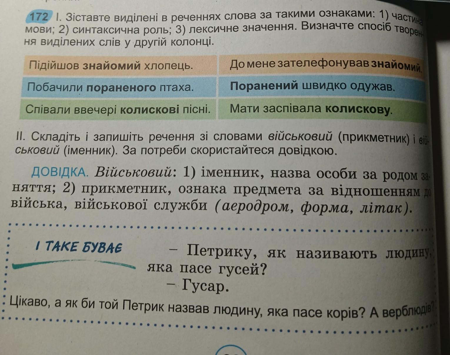 172 І. Зіставте видiлені в реченнях слова за такими ознаками: 1) частина мови; 2) синтаксична роль; 3) лексичне значення. Визначте спосіб творен ня виділених слів у другій колонці. Підійшов знайомий хлопець. Побачили пораненого птаха. Співали ввечері колискові пісні. II. Складіть і запишіть речення зі словами військовий (прикметник) і вій- ськовий (iменник). За потреби скористайтеся довідкою. ДОВІДКА. Вiйськовий: 1) іменник, назва особи за родом за- няття; 2) прикметник, ознака предмета за відношенням до війська, військової служби (аеродром, форма, літак). I ТАКЕ БУВАЕ - До мене зателефонував знайомий Поранений швидко одужав. Мати заспівала колискову. - Петрику, як називають людину, яка пасе гусей? Гусар. Цікаво, а як би той Петрик назвав людину, яка пасе корів? А верблюдiв? :