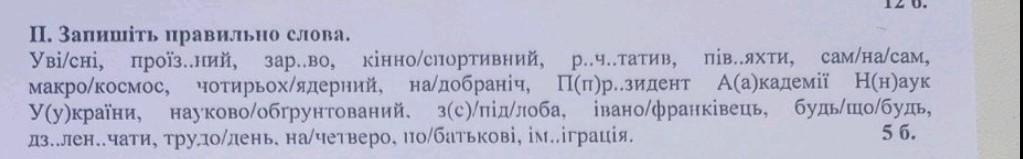 Запишіть правильно слова. Увi/снi, проїз..ний, макро/космос, чотирьох/ядерний, У(у)країни, науково/обгрунтований, з(с)/пiд/лоба, дз..лен..чати, трудо/день, на/четверо, по/батьковi, iм..iграцiя, кінно/спортивний, р..ч..татив, пiв..яхти, сам/на/сам, на/добраніч, П(п)р..зидент А(а)кадемії Н(н)аук івано/франкiвець, будь/що/будь,