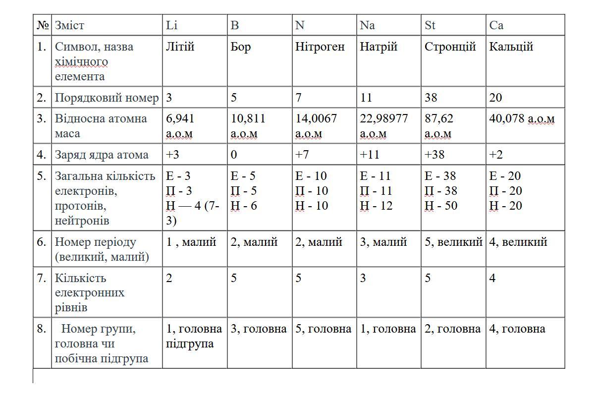 в зошиті замалювати таблицю, внести дані про наступн Li, B, N, Na, St Ca 1. Символ, назва хiмiчного елемента 2. Порядковий номер 3. Відносна атомна маса 4. Заряд ядра атома 5.Загальна кількість електронів, протонів, нейтронів 6. Номер періоду (великий, малий) 7. Кількість електронних рівнів 8. Номер групи, головна чи побічна підгрупа