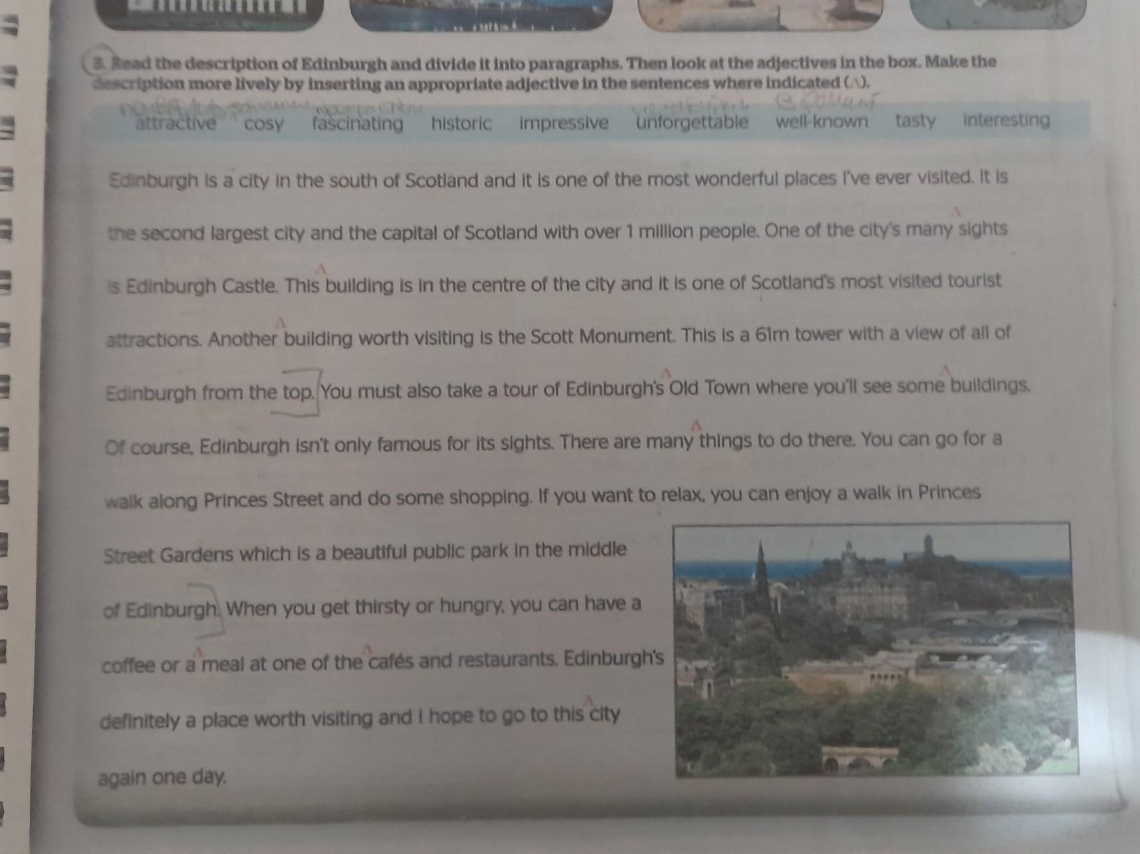 3. Read the description of Edinburgh and divide it into paragraphs. Then look at the adjectives in the box. Make the description more lively by inserting an appropriate adjective in the sentences where indicated (A). COVER+ attractive cosy fascinating historic impressive unforgettable well-known tasty Interesting Edinburgh is a city in the south of Scotland and it is one of the most wonderful places I've ever visited it is the second largest city and the capital of Scotland with over 1 million people. One of the city's meny sights is Edinburgh Castle. This building is in the centre of the city and it is one of Scotland's most visited tourist attractions. Another building worth visiting is the Scott Monument. This is a 61m tower with a view of all of Edinburgh from the top. You must also take a tour of Edinburgh's Old Town where you'll see some buildings. Of course, Edinburgh isn't only famous for its sights. There are many things to do there. You can go for a walk along Princes Street and do some shopping. If you want to relax, you can enjoy a walk in Princes Street Gardens which is a beautiful public park in the middle of Edinburgh. When you get thirsty or hungry, you can have a coffee or a meal at one of the cafés and restaurants. Edinburgh's definitely a place worth visiting and I hope to go to this city again one day. найдійть 3 абзаца. і там де червоні голочки вставте слова. даю 100 балів