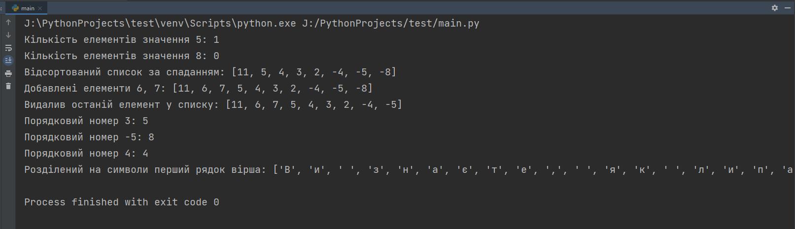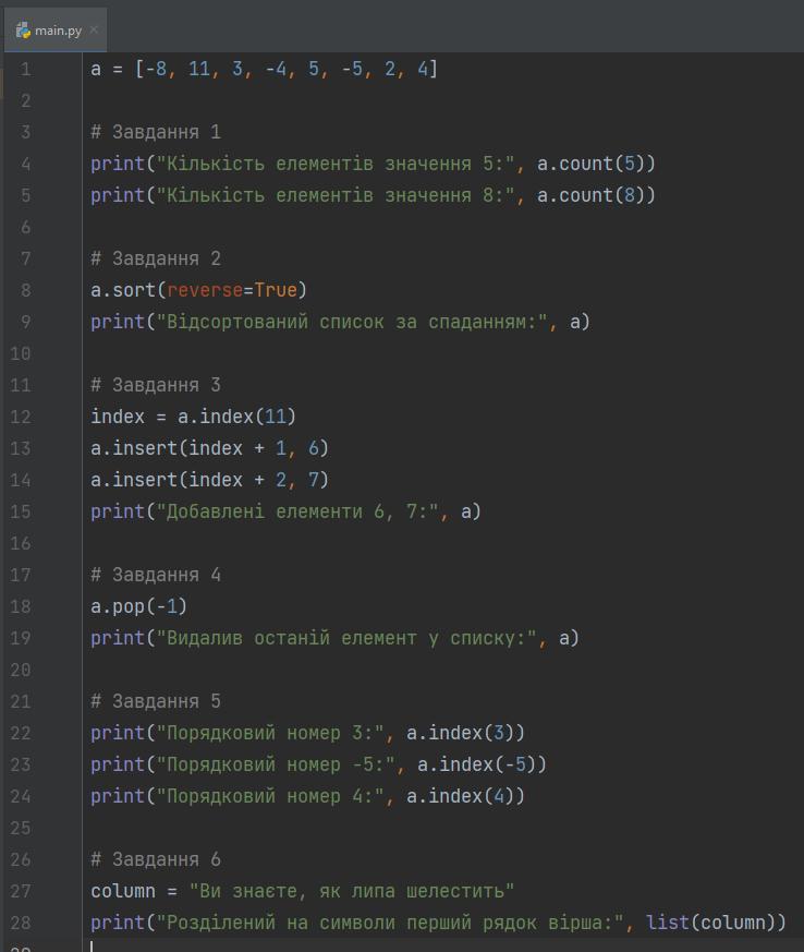 Задайте список a [-8, 11, 3, -4, 5, -5, 2, 4] Визначте: 1. Кількість елементів, що має значення «5» та «8» 2. Відсортуйте елементи списку за спаданням. 3. Додайте числа 6 та 7 після числа 11 до списку. 4. Видаліть останній елемент у списку. 5. Визначить порядкові номери чисел 3, -5 та 4. 6. Запишіть перший рядок вашого улюбленого вірша та розділіть його на список слів, а потім символів.