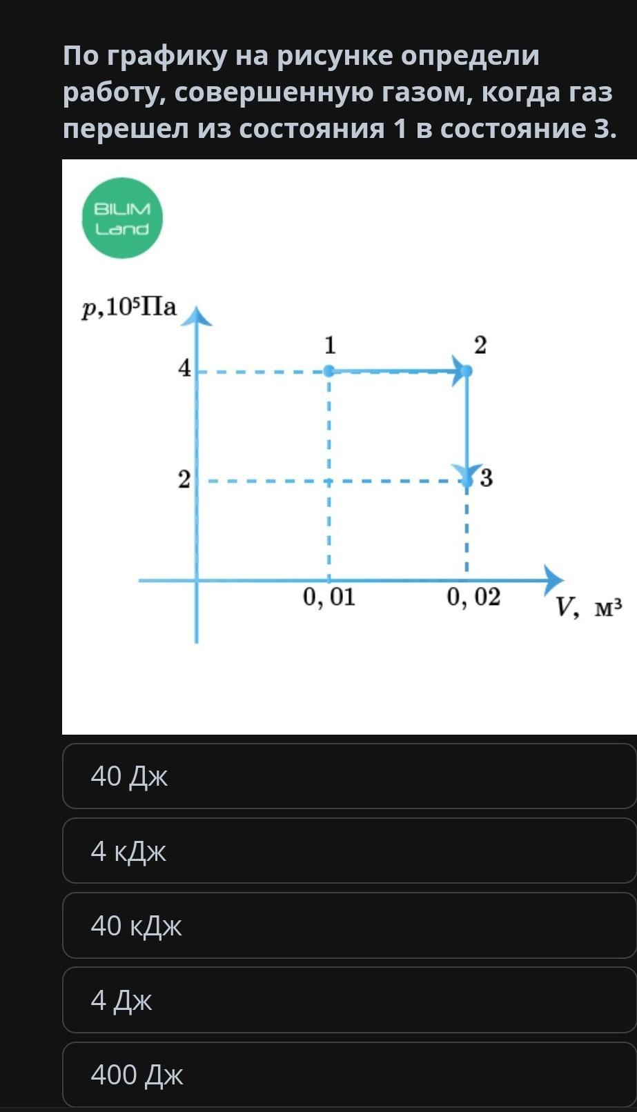 Как видно из графика на рисунке, достаточно определить площадь рисунка под графиком, чтобы определить работу, совершаемую газом. Эта область (1-2-3) выделена на рисунке. Поэтому мы определяем работу, совершаемую газом при переходе из состояния 1 в состояние 3, следующим образом: А = 4·105 Па (0,02-0,01)м3 = 4000 Дж = 4 кДж.