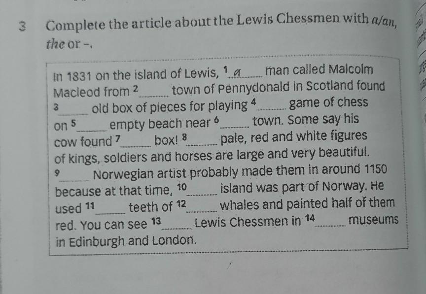 3 Complete the article about the Lewis Chessmen with a/an, the or -. In 1831 on the island of Lewis, 1 a man called Malcolm Macleod from 2 town of Pennydonald in Scotland found 3 old box of pieces for playing game of chess on 5________empty beach near 6 town. Some say his cow found 7 box! _________ pale, red and white figures of kings, soldiers and horses are large and very beautiful. Norwegian artist probably made them in around 1150 because at that time, 10 island was part of Norway. He used 11 teeth of 12 whales and painted half of them Lewis Chessmen in 14 museums 9 red. You can see 13 in Edinburgh and London.