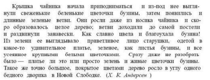 Крышка чайника начала приподниматься, и из под неё выглянули свеженькие беленькие цветочки бузины, затем появились и длинные зелёные ветви. Они росли даже из носика чайника и скоро образовалось целое дерево; ветви доходили до самой постели, и раздвинули занавески. Как славно цвела благоухая бузина!