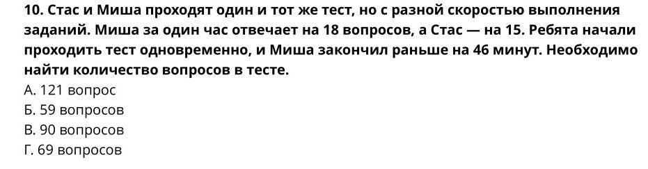 10. Стас и Миша проходят один и тот же тест, но с разной скоростью выполнения заданий. Миша за один час отвечает на 18 вопросов, а Стас - на 15. Ребята начали проходить тест одновременно, и Миша закончил раньше на 46 минут. Необходимо найти количество вопросов в тесте. A. 121 Вопрос Б. 59 вопросов В. 90 вопросов Г. 69 вопросов