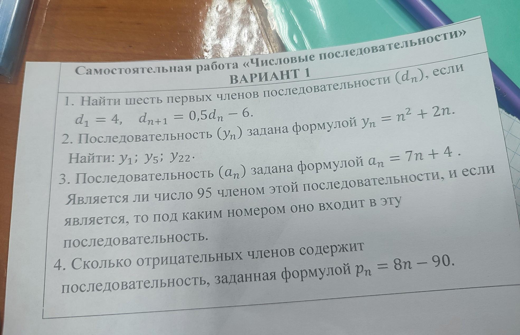 Самостоятельная работа «Числовые последовательности» ВАРИАНТ 1 1. Найти шесть первых членов последовательности (dn), если d1 = 4, dn+1 0,5dn -6. - 2. Последовательность (ул) задана формулой yn = n² + 2n. = = - Найти: у1; у5; У22. = 7n +4. 3. Последовательность (an) задана формулой ап Является ли число 95 членом этой последовательности, и если является, то под каким номером оно входит в эту последовательность. 4. Сколько отрицательных членов содержит последовательность, заданная формулой рn = 8n - 90.