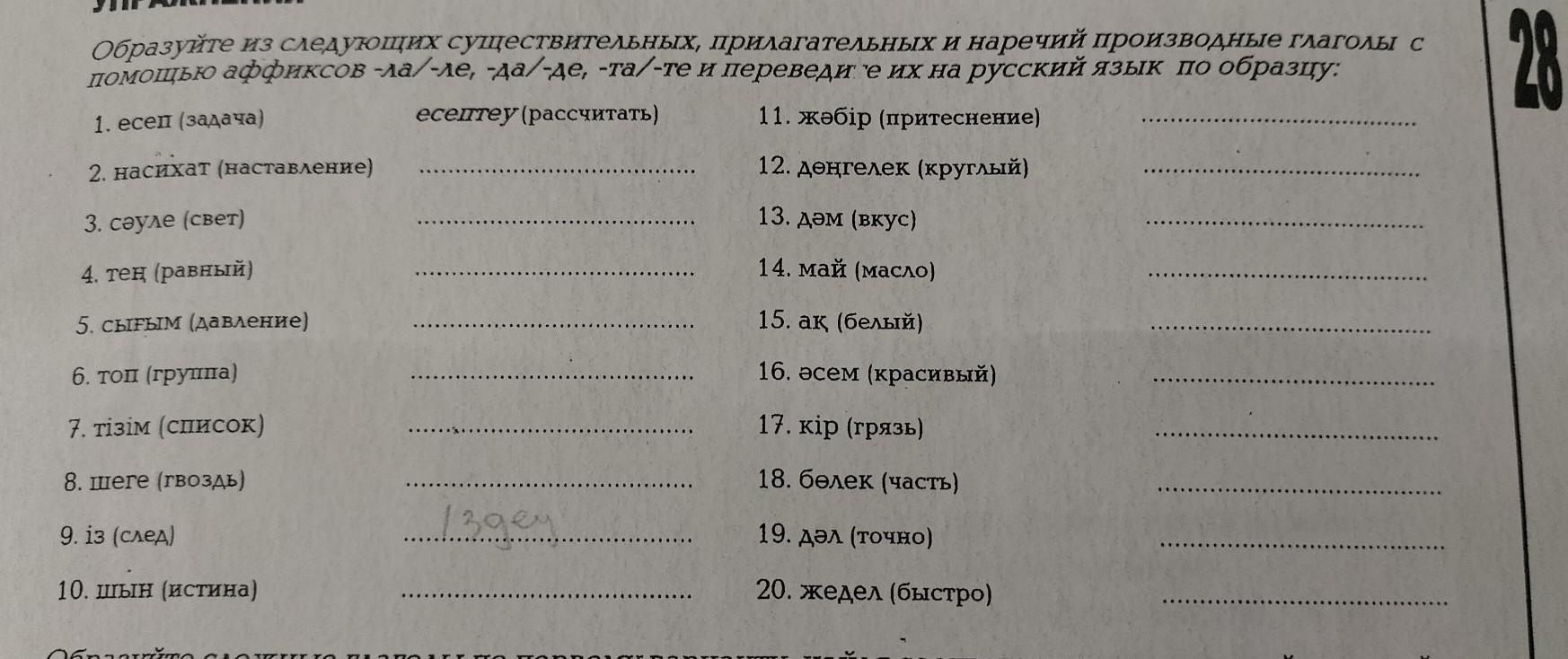 УПРАЖНЕНИЯ Образуйте из следующих существительных, прилагательных и наречий производные глаголы с помощью аффиксов -ла/-ле, -да/-де, -та/-те и переведи е их на русский язык по образцу: 1. есеп (задача) есептеу (рассчитать) 11. жәбiр (притеснение) 2. насихат (наставление) 12. деңгелек (круглый) 3. сәуле (свет) 13. дәм (вкус) 4. тен (равный) 14. май (масло) 5. сығым (давление) 15. ак (белый) 6. топ (группа) 16. әсем (красивый) 7. тізім (список) 17. кір (грязь) 8. шеге (гвоздь) 18. бөлек (часть) 9. iз (след) 19. дәл (точно) 10. шын (истина) 20. жедел (быстро) издец УРО