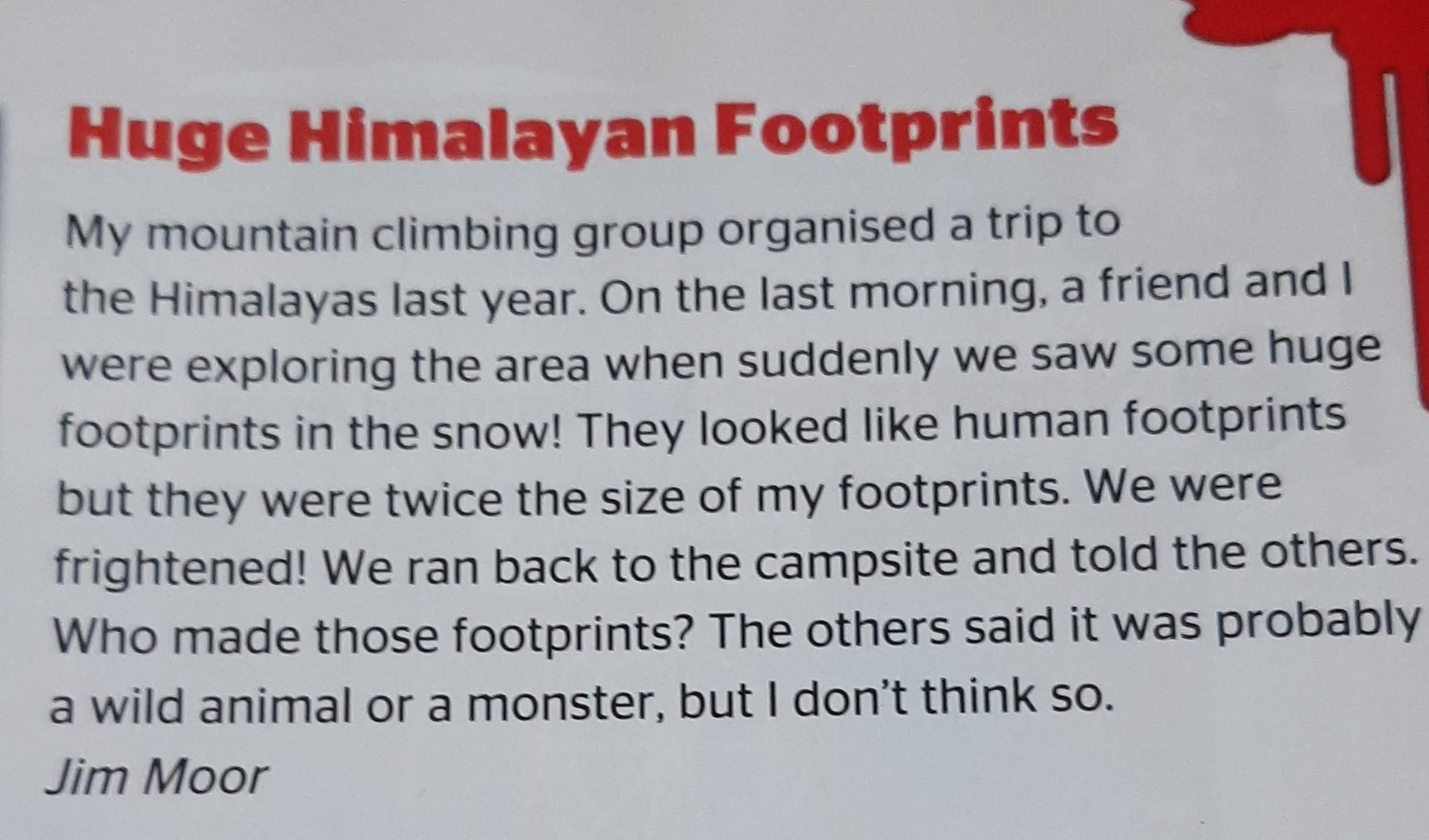 Last year, my rock climbing group went to the Himalayas. And the next morning, my friend and I explored the area. We found huge footprints! They were twice as big as mine. We got scared and ran back to the campsite and told everyone. Who did it? We asked. Everyone said it was probably a wild animal, or a monster, but I don't think so.