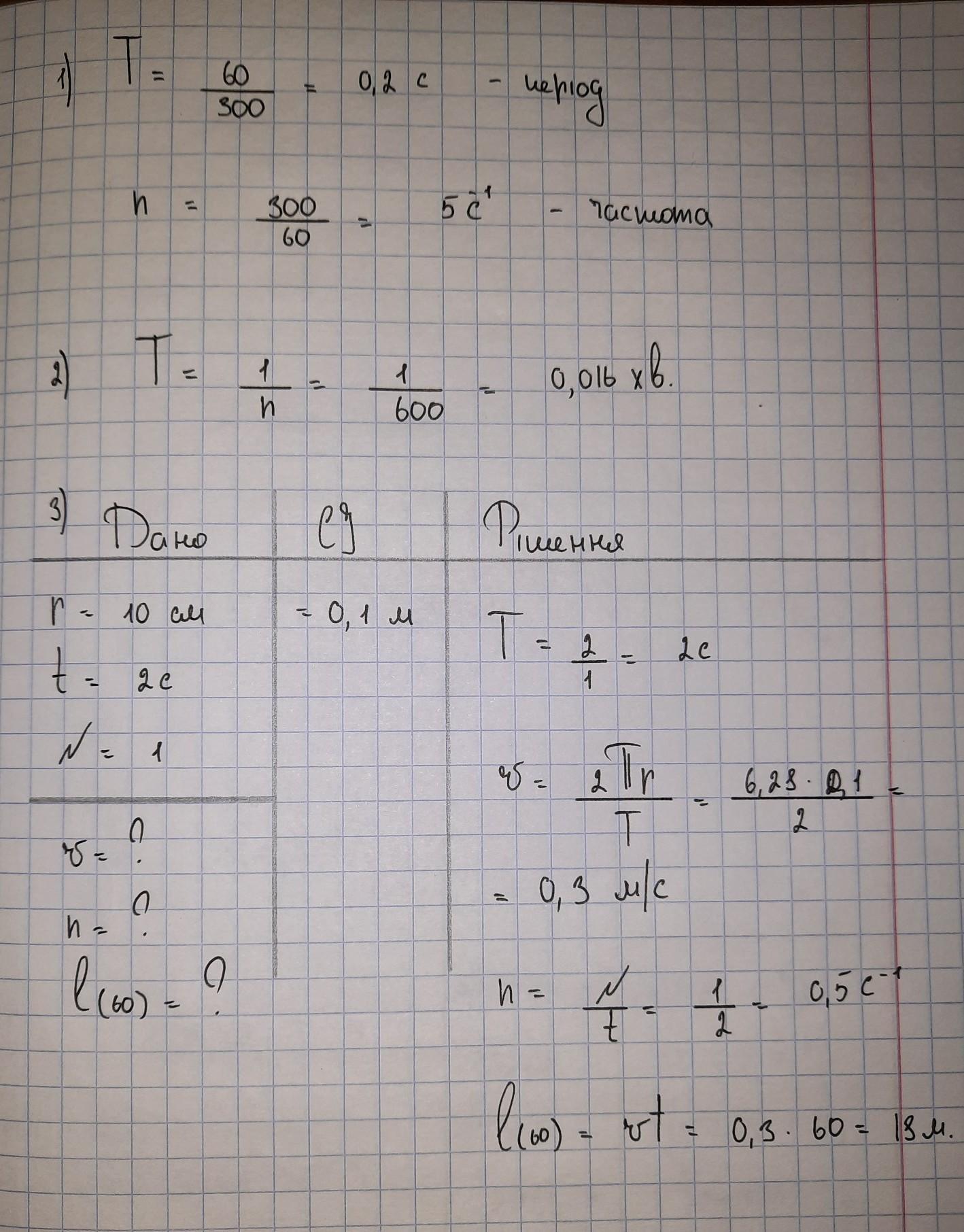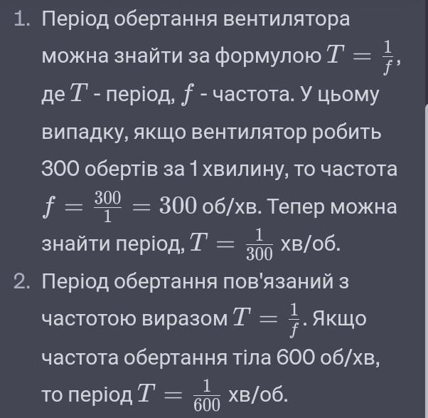 1.Знайти період та частоту обертання вентилятора, який за 1хв здійснює 300 обертів.