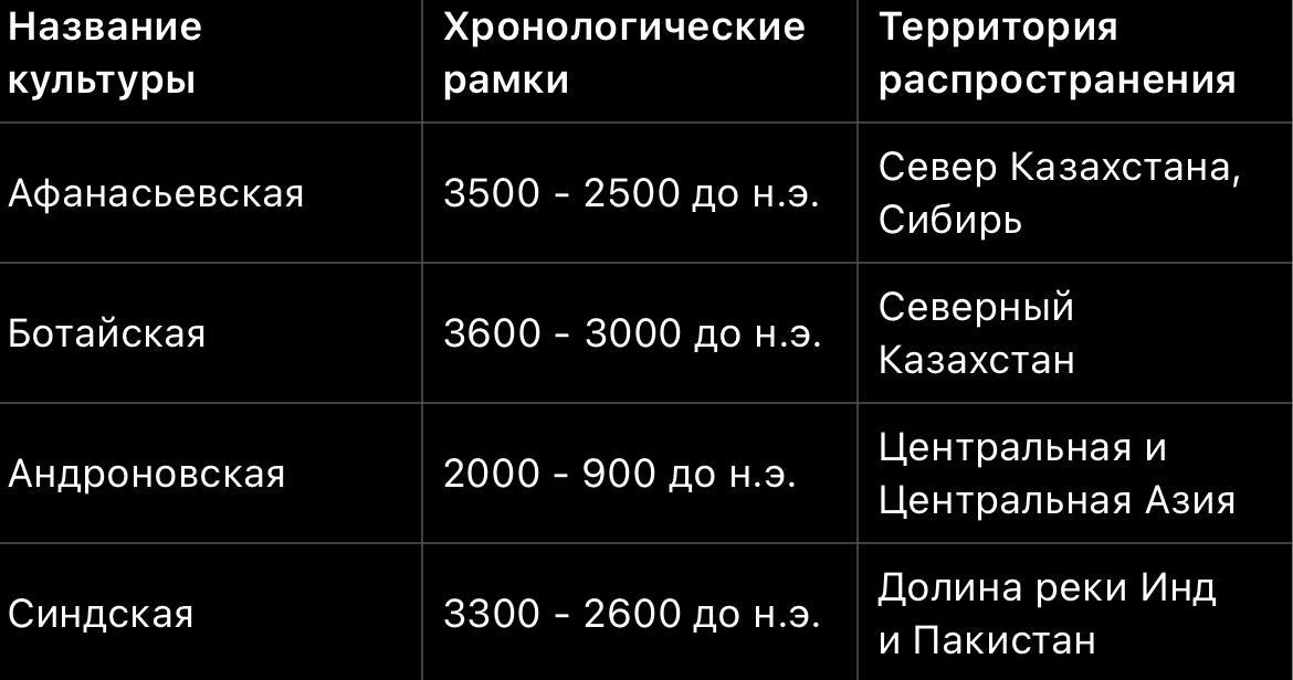 1. Дайте определение эпохе энеолита. 2. Охарактеризуйте ботайскую культуру. Как вы думаете, в чем ее особенность. 3. Расскажите, что вы знаете о переселении индоиранских пле- мен. Какие культуры получили распространение на террито- рии Казахстана? 4. Заполните таблицу «Культуры эпохи энеолита. Название культуры. Хронологические рамки Территория распространения Особенности................пж ответте