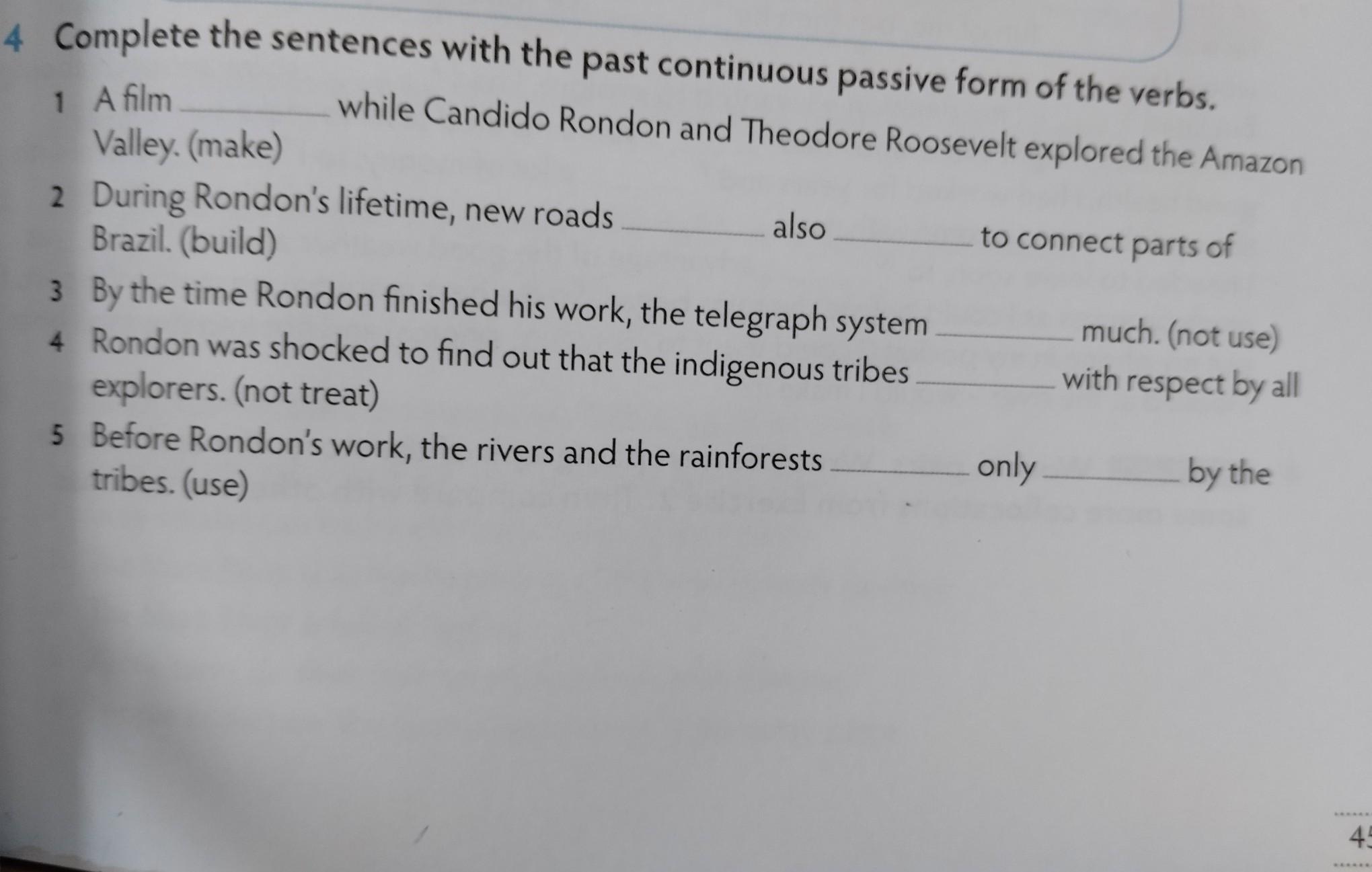 Complete A film sentences with the past continuous passive form of the verbs. while Candido Rondon and Theodore Roosevelt explored the Amazon Valley. (make) During Rondon's lifetime, new roads Brazil. (build) also By the time Rondon finished his work, the telegraph system Rondon was shocked to find out that the indigenous tribes explorers. (not treat) Before Rondon's work, the rivers and the rainforests tribes. (use) to connect parts of only much. (not use) with respect by all by the