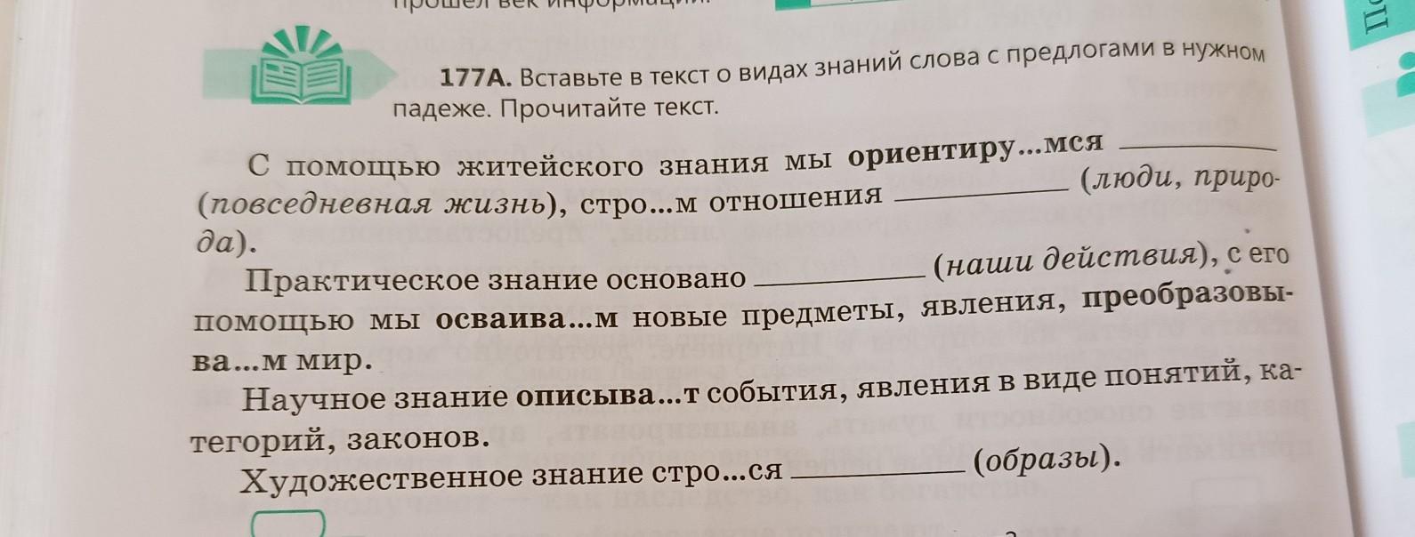 177A. Вставьте в текст о видах знаний слова с предлогами в нужном падеже. Прочитайте текст. С помощью житейского знания мы ориентиру...мся (повседневная жизнь), стро...м отношения (люди, приро- Практическое знание основано (наши действия), с его помощью мы осваива...м новые предметы, явления, преобразовы- да). ва...м мир. Научное знание описыва...т события, явления в виде понятий, ка- тегорий, законов. Художественное знание стро...ся (образы).