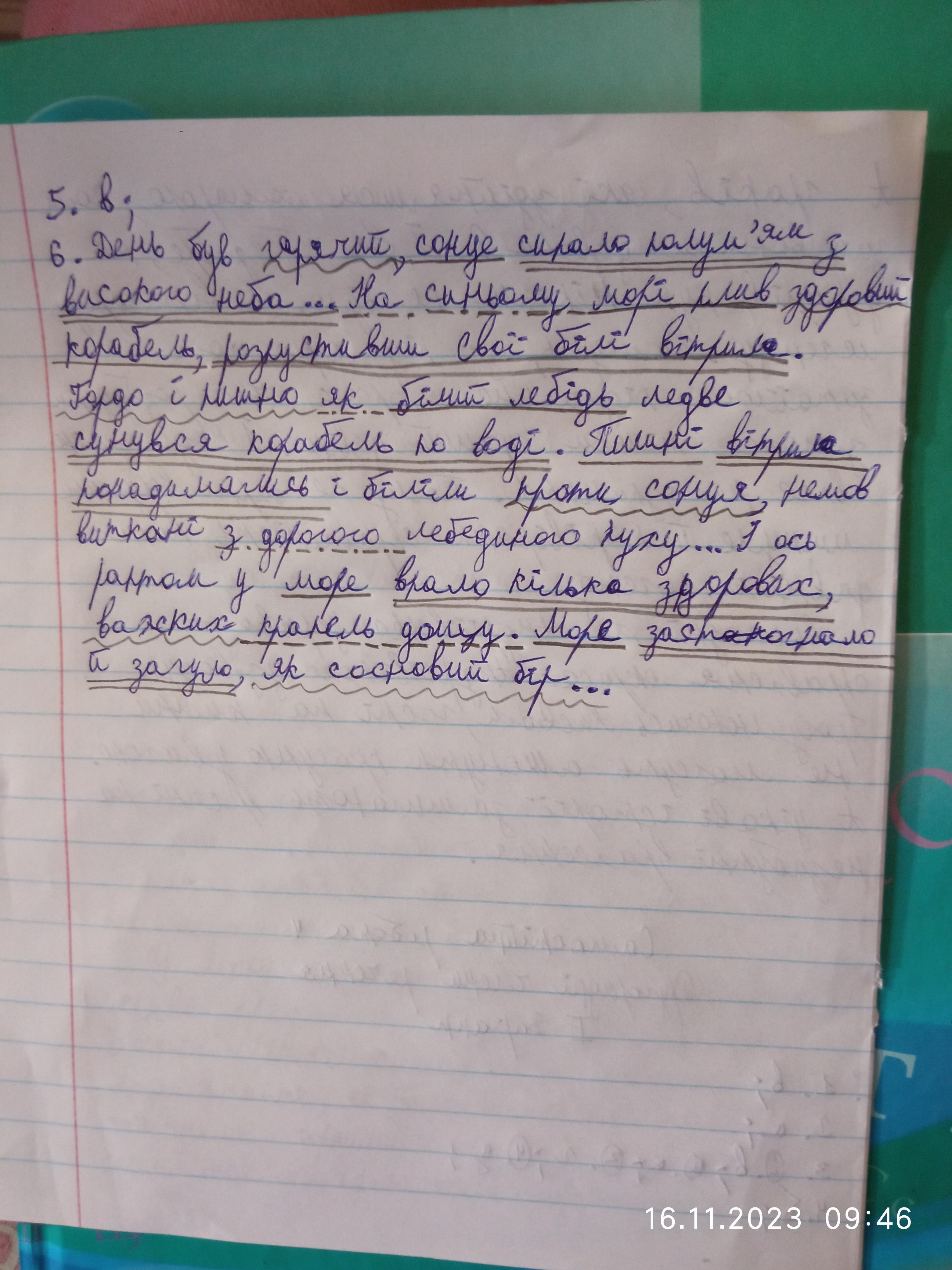1) День був гарячий, сонце сипало полум'ям з високого неба... (2) На синьому морі плив здо-ровий корабель, розпустивши свої білі вітрила. (3) Гордо і пишно як білий лебідь ледве сунувся корабель по воді. (4) Пишні вітрила понадимались і бiлiли проти сонця, немов витканi з доро-гого лебединого пуху... (5) І ось раптом у море впало кілька здорових, важких крапель дощу. (6) Море застогнало й загуло, як сосновий бiр... (За І. Нечуем-Левицьким)Підкресліть у текстi всi другорядні члени реченняОзначення е в усіх реченнях, ОКРІМ