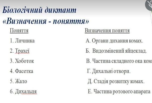 «Визначення - поняття» ПОНЯТТЯ 1. Личинка 2. Трахеї 3. Хоботок 4. Фасетка 5. Жало 6. Дихальця Визначення поняття А. Органи дихання комах. Б. Видозмiнений яйцеклад. В. Частина складного ока комах. Г. Дихальні отвори. Д. Стадія розвитку комах. Е. Частина ротового апарата