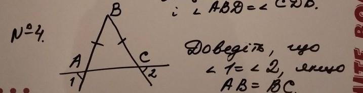 Ми маємо рівність двох бічних сторін, що каже про вид трикутника - рівнобіний, а кути при основі такого трикутника рівні. 1 і 2 - вертикальні до цих кутів кути, тому можна стверджувати, що вони однакові