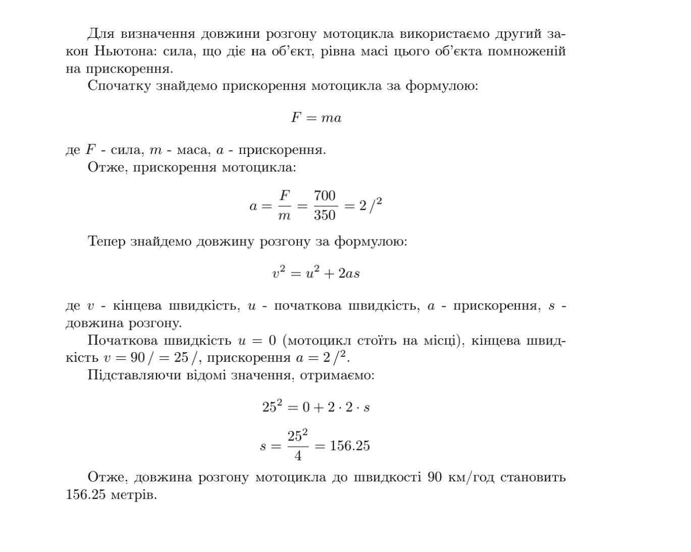Визначте довжину розгону мотоцикла до швилкості 90 км/год, якщо маса мотоцикла 350 кг, а сила двигунів становить 700 Н.