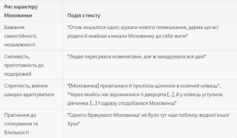 Надіюсь, ця таблиця відображає риси характеру Моховинки та відповідні події з тексту!
