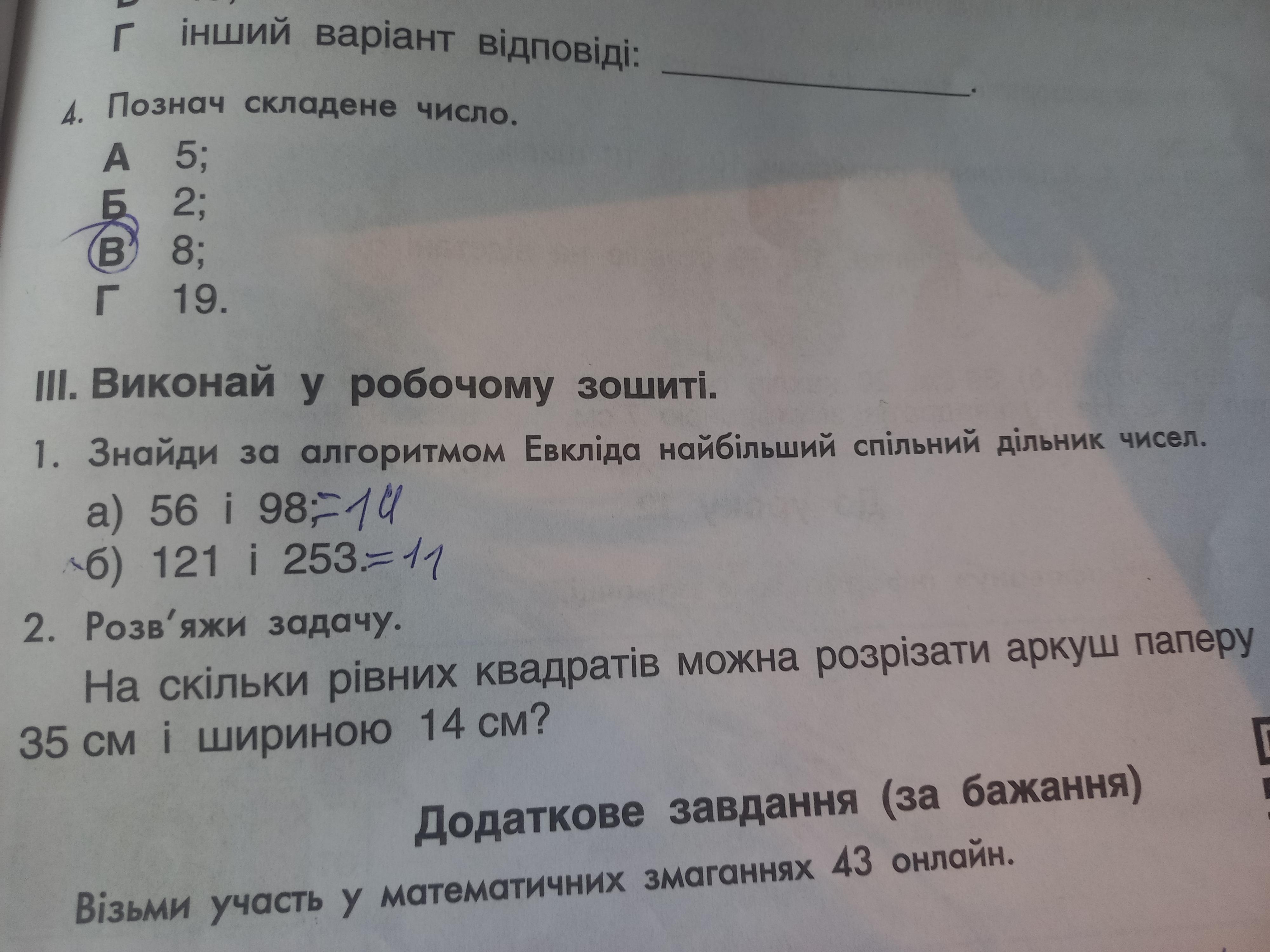 Помогите пожалуйста даю 30 балов задание 1.Знайди за алгоритмом Евкліда спільний дільник чисел а)56 і 98
