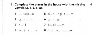 It looks like you have an image of an exercise to complete the names of places in a house by filling in the missing vowels (a, e, i, o, u). Here are the answers: