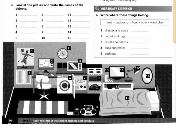 You have an image depicting various household items with numbered labels and an exercise to write the names of the objects. Here are the answers: