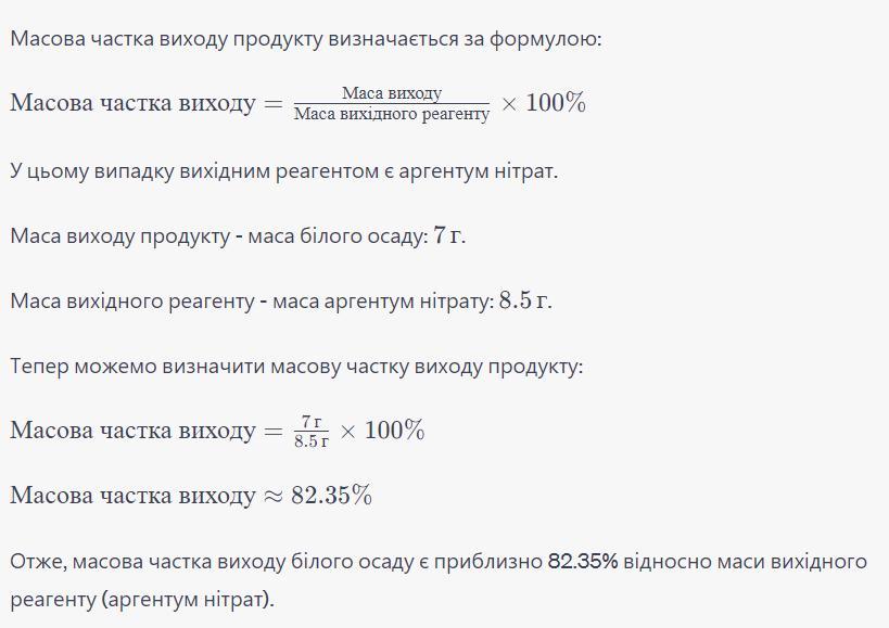 Випав білий осад масою 7 г.Визначити масову частку виходу продукту за відношенням до теоретичного.