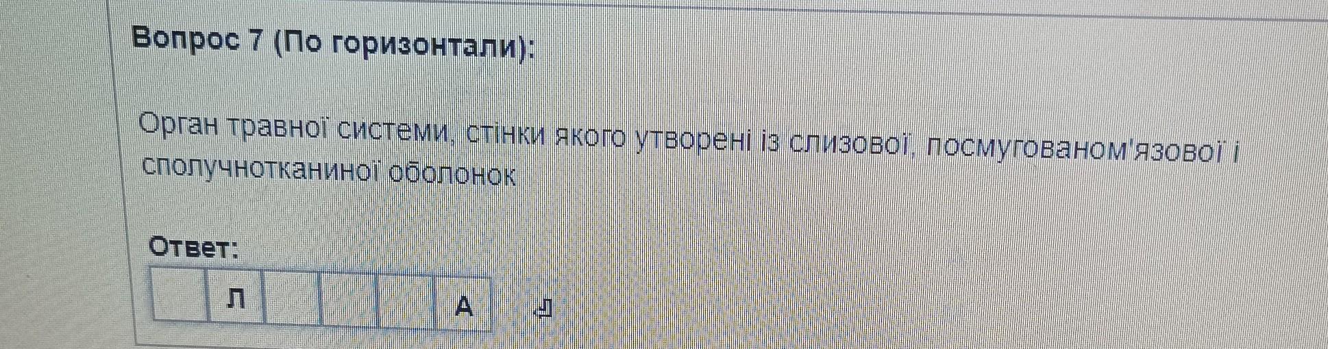 Вопрос 7 (По горизонтали): Орган травної системи, стінки якого утворені із слизової, посмугованом'язовоï i сполучнотканиної оболонок