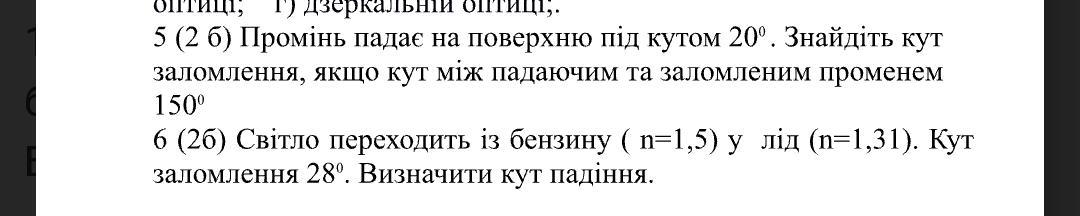 5 (26) Промінь падає на поверхню під кутом 20°. Знайдіть кут заломлення, якщо кут між падаючим та заломленим променем 1500